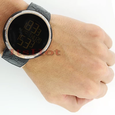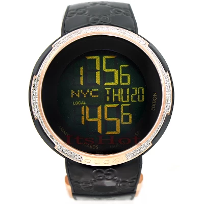 This Men’s Diamond Watch from Limited Edition “Latin Grammy” with a custom-made bezel features 2.80 carats of sparkling round diamonds around the rose gold tone stainless steel case, a scratch-resistant sapphire crystal, a glossy rubber band with a Gucci logo motif, and a digital dial code. This custom diamond Gucci watch showcases a fine Swiss-made quartz Movement.