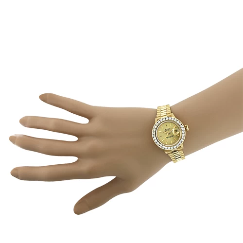 This solid 18k Yellow Gold Ladies Rolex Oyster Diamond Watch Perpetual Datejust showcases 3 carats of genuine custom set diamonds and an 18K yellow gold case and bracelet. This luxurious ladies’ diamond Rolex watch features a date display at the 3 o’clock position and a hidden deployment clasp. This Ladies ROLEX Oyster Watch Perpetual Datejust is pre-owned in excellent condition and makes a wonderful gift for a special occasion.
