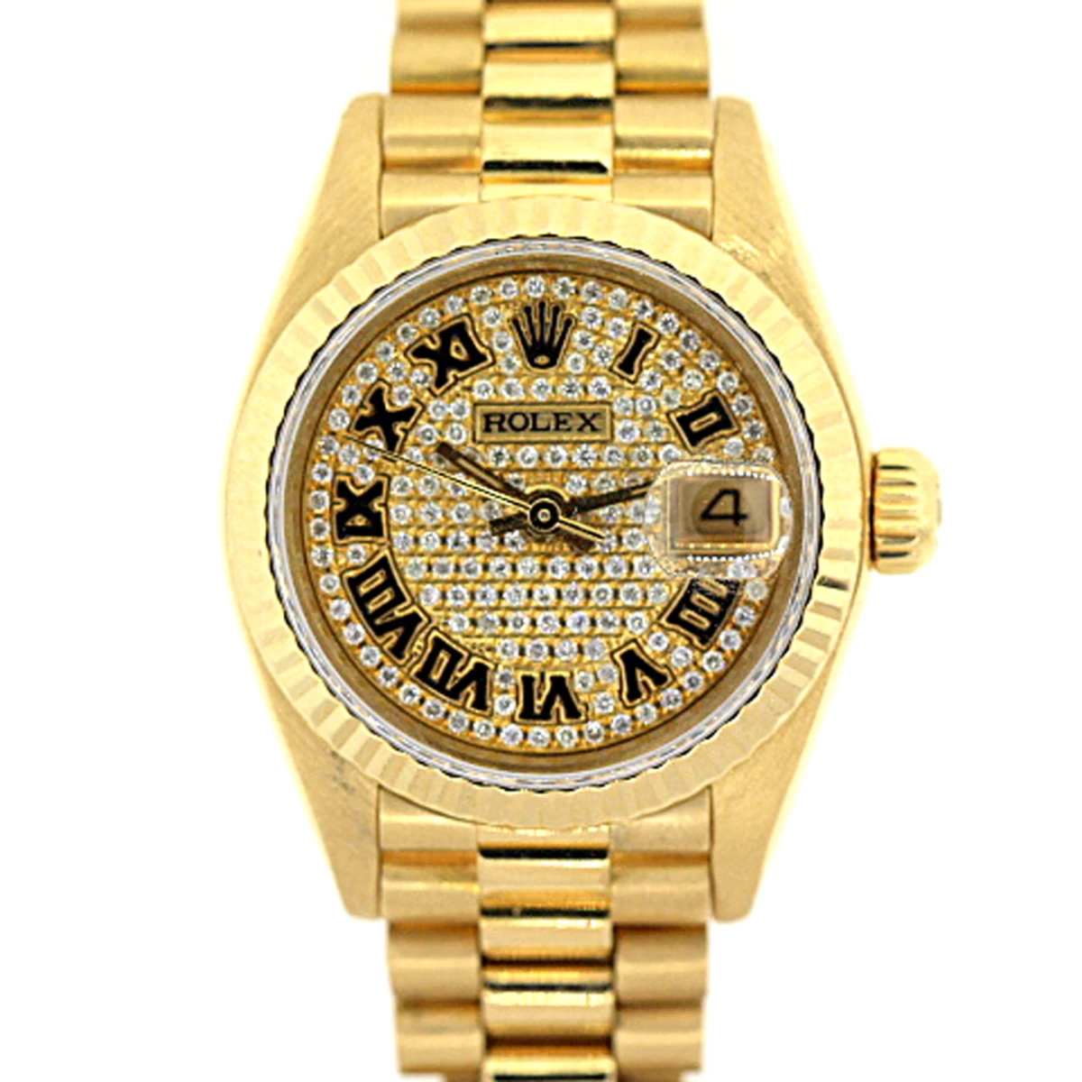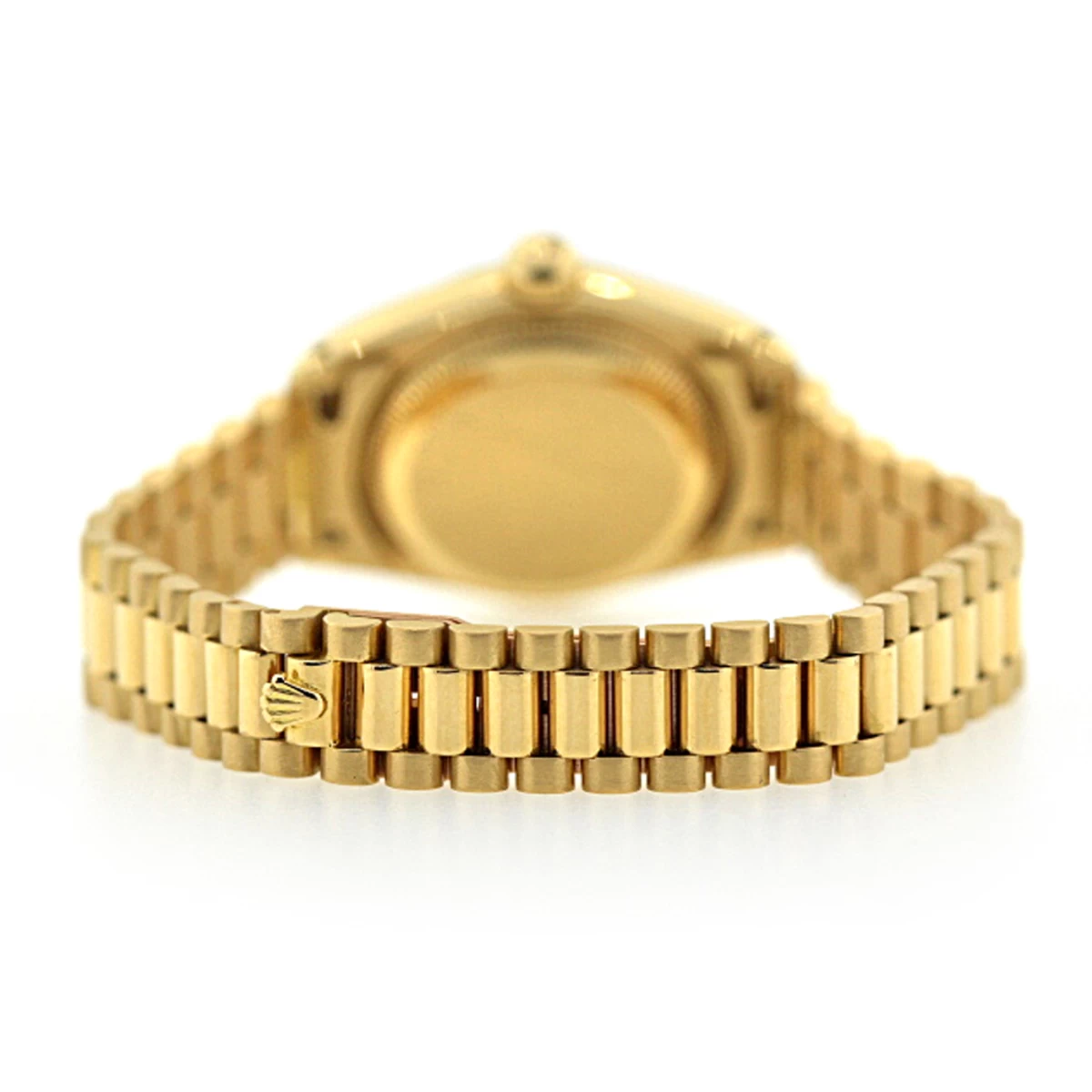 This 18K Gold Rolex Presidential Datejust Diamond Watch for Women is the perfect combination of luxury and style. Crafted with 18K yellow gold, this watch features a 26mm case with a sapphire crystal dial window, scratch-resistant and a date indicator. The bezel and bracelet are also made of 18K yellow gold, and the bracelet type is an Oyster. The dial is adorned with 2 carats of diamonds, and the hands and markers are gold tone and black, respectively. The movement is automatic, and the style is iced-out, luxury, small, and unique.This watch is perfect for any occasion, whether it’s a formal event or a casual outing. It’s sure to make a statement and turn heads wherever you go. The 18K gold and diamonds make it a timeless piece that will never go out of style. It’s a great gift for any woman who loves luxury and style.This watch is a great investment that will last for years to come. It’s a piece of jewelry that will never go out of style and will always be a conversation starter. It’s a timeless piece that will look great with any outfit. It’s the perfect accessory for any woman who loves luxury and style.