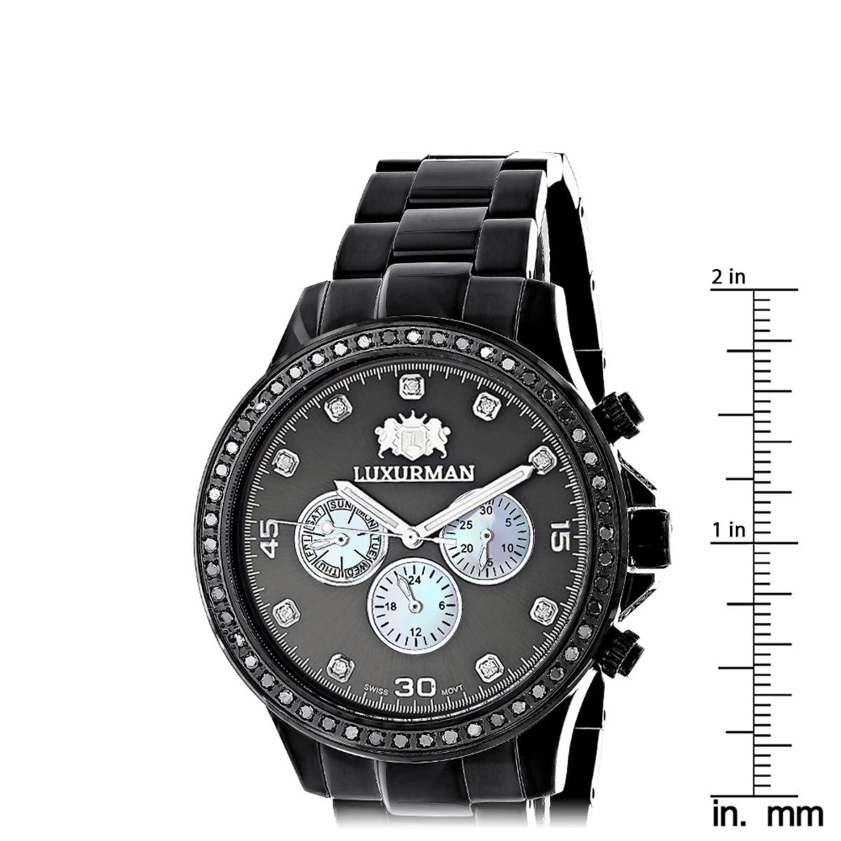 This 2 Carat Black Diamond Bezel Watch for Men by Luxurman showcases 2 carats of sparkling round diamonds. Features a black dial with three subdials and a black tone stainless steel band. This luxurious men’s diamond watch by Luxurman houses a fine Swiss-made quartz movement and comes with two interchangeable straps in different colors (band colors may vary).