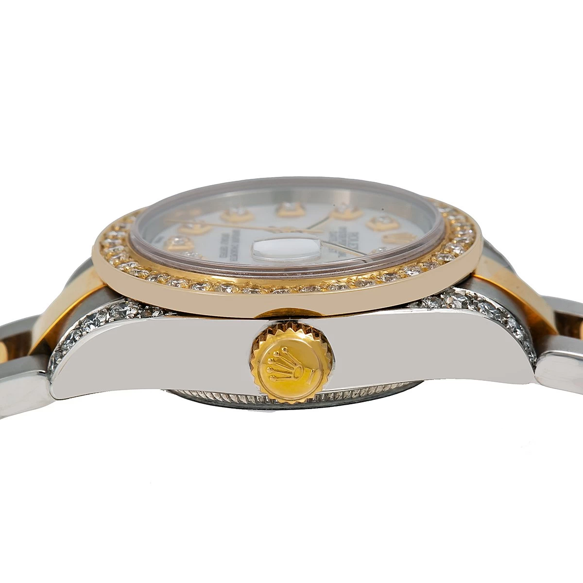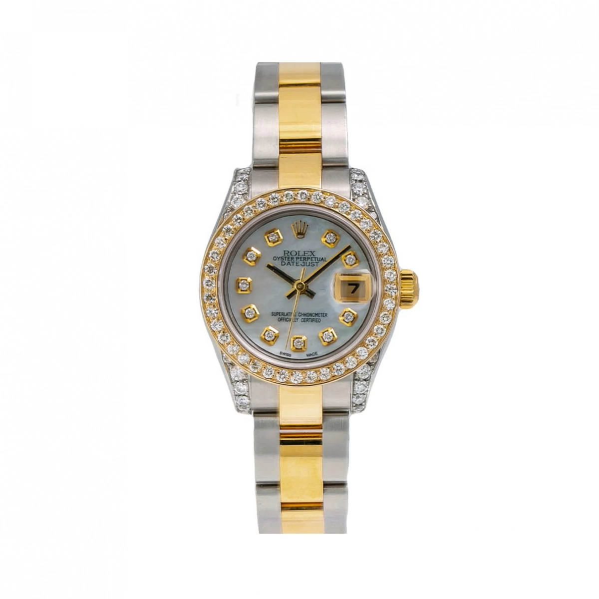 This Rolex Datejust 179173 26mm Silver Diamond Dial With 1.25 carats of Diamonds for ladies is extremely stylish and elegant with the beautiful silver dial shimmering alongside the dazzling white round diamonds. The incrusted bezel is made in yellow gold which makes the precious diamonds shine even brighter due to the complimenting contrast with yellow gold. The lugs of the watch are also incrusted for continuous sparkle from every angle. Diamonds in hours markers and a date display at the 3 o’clock position complete this brilliant companionship of a timepiece and impeccable style. The two tones of the oyster bracelet – make it a perfect match for any outfit and will be an unforgettable gift for yourself or your loved one. Please note: this ladies diamond Rolex watch is pre-owned, in flawless condition and comes in an original box with a full 5 year warranty from ItsHot.com.