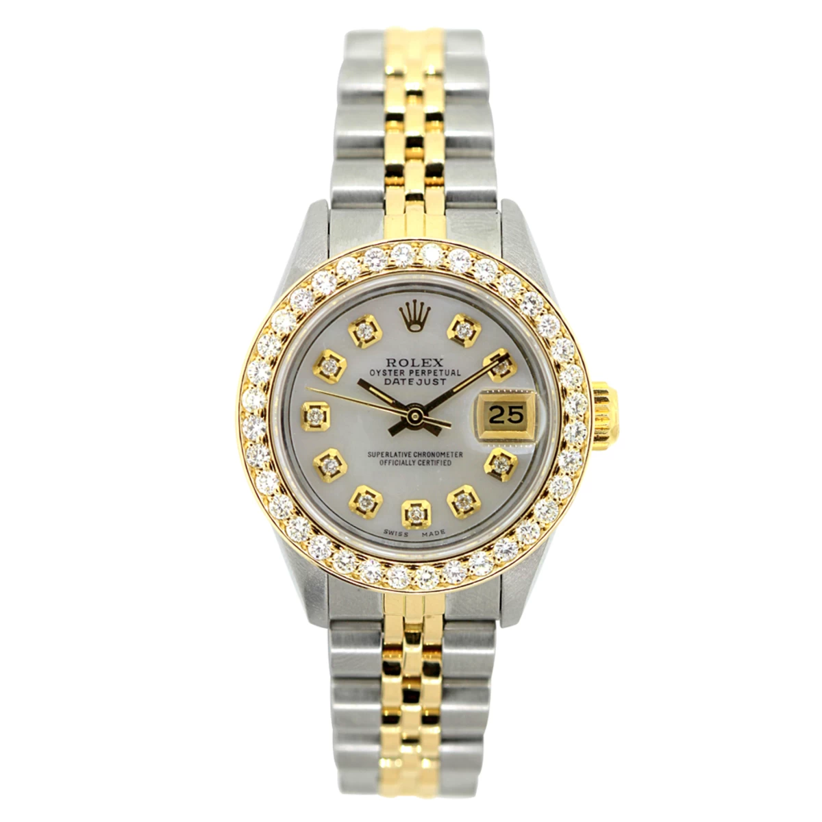 This luxurious Rolex Datejust Ladies Custom Diamond Watch features 1.2 carats of sparkling genuine diamonds set on a gold bezel, a brushed stainless steel case and a stainless steel and gold band. This Rolex Ladies Diamond Watch showcases a white mother of pearl dial and a date display at the 3 o’clock position. Please note: this custom Rolex diamond watch is pre-owned and comes with a full year warranty from ItsHot.com.
