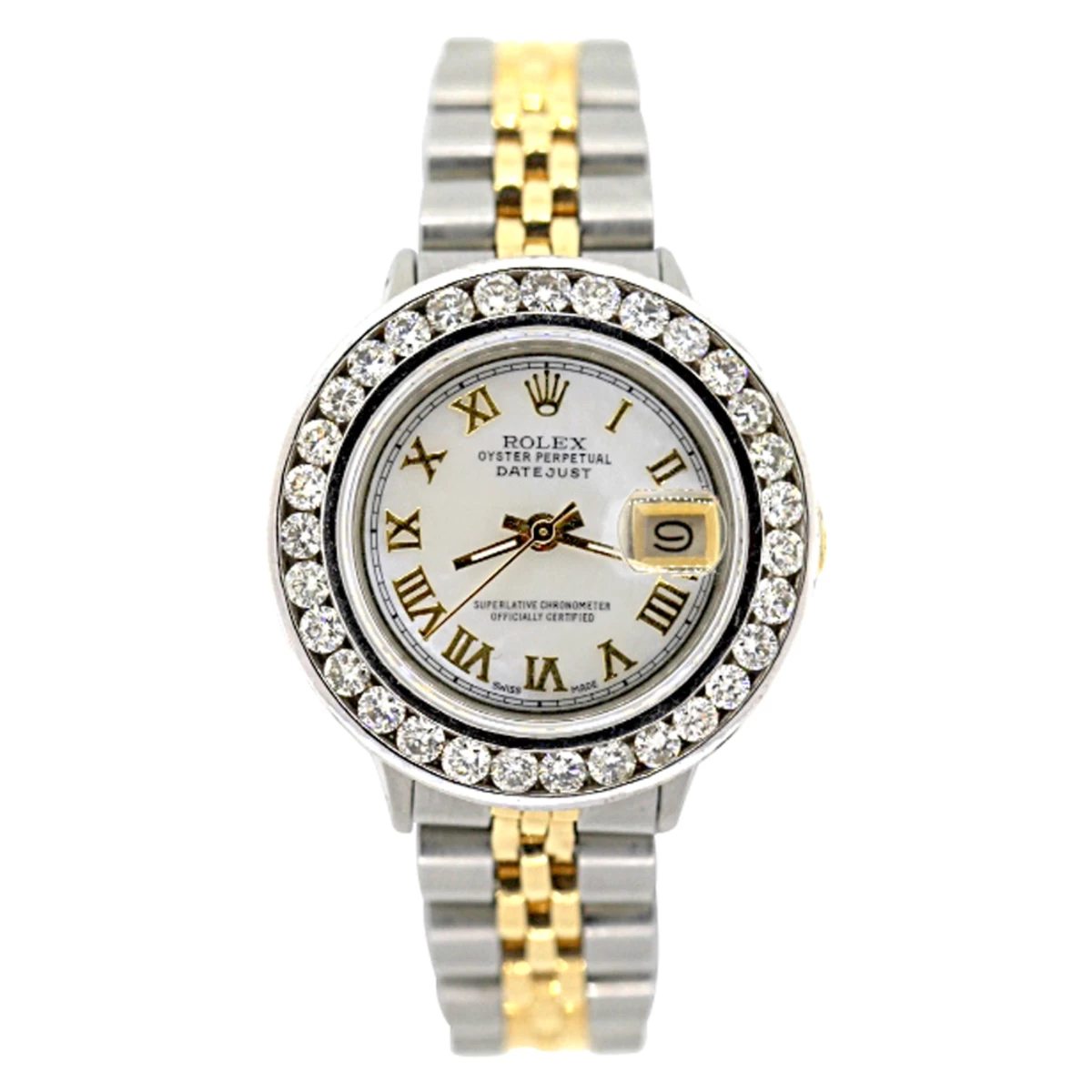 This luxurious Rolex Datejust Women’s Diamond Watch features white MOP dial, a diamond bezel with 2 carats of sparkling genuine diamonds, a brushed stainless steel case and a stainless steel and 18k gold plated band. This Rolex Ladies Diamond Watch showcases a white mother of pearl dial and a date display at the 3 o’clock position. This custom Rolex diamond watch for women is pre-owned, in excellent condition and comes with a full year warranty from ItsHot.com.