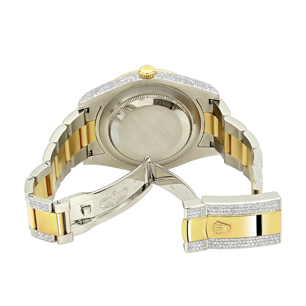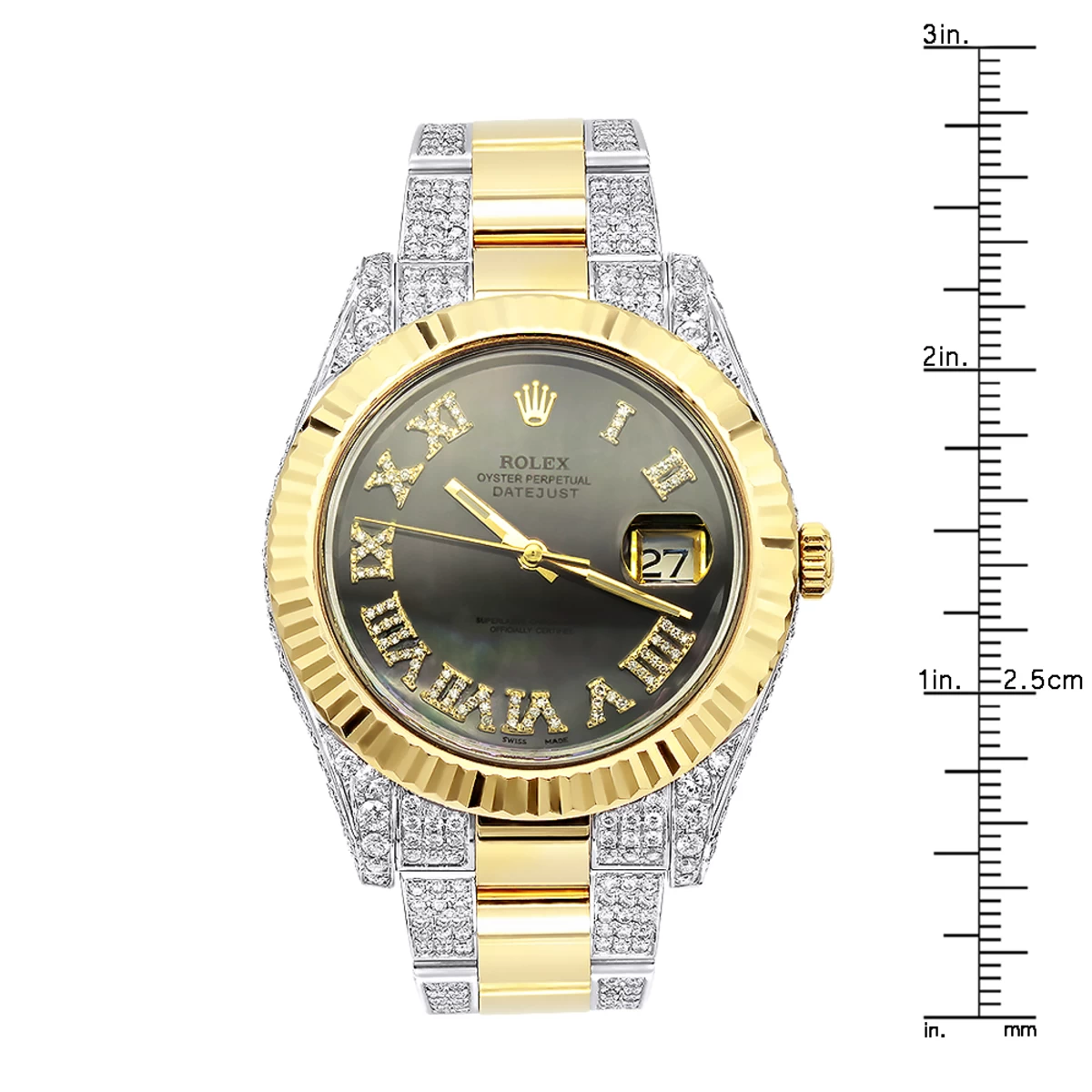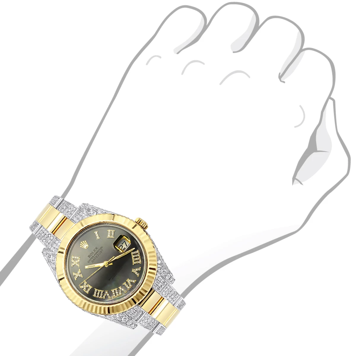 This amazing Gold & Stainless Steel Rolex Oyster Perpetual Datejust Diamond Watch for Men sports a 41mm case and is decorated with 7.5 carats of sparkling genuine diamonds masterfully set on a case, band, clasp, and even roman numerals on its dial. This amazing Rolex Men’s Diamond Watch features a green mother of pearl dial with Roman numerals decorated with dazzling diamonds and a date display at the 3 o’clock position. This custom Rolex diamond watch for men is pre-owned, in excellent condition, and comes with an original Rolex box and a 5-year warranty from ItsHot.com.