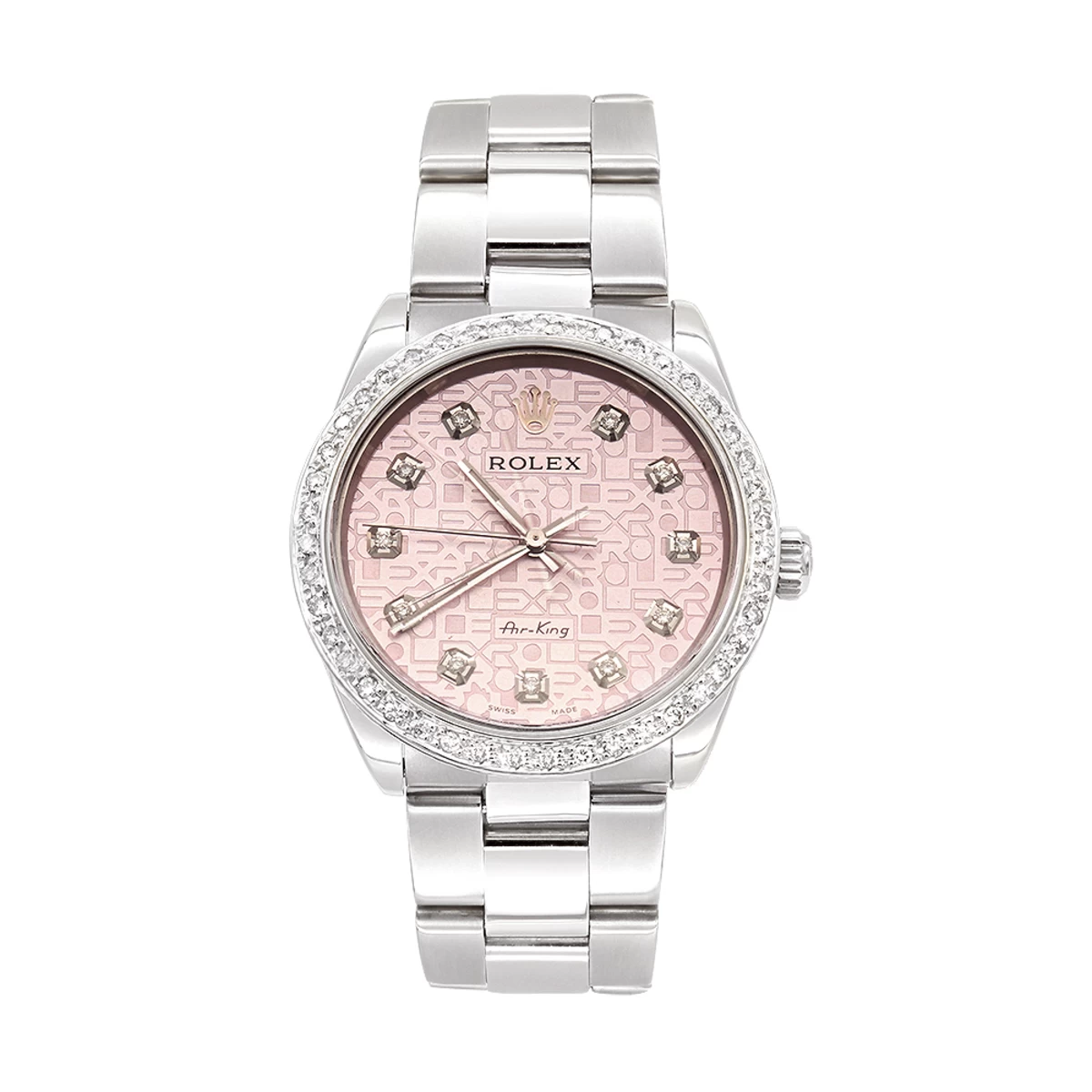 This lovely Stainless Steel Custom Air King Rolex Diamond Watch for Women features 2 carats of sparkling genuine diamonds masterfully set in a bezel and showcases a feminine pink dial. This custom Rolex diamond watch is pre-owned, in excellent condition, and comes with an original Rolex box and a 5-year warranty from ItsHot.com.