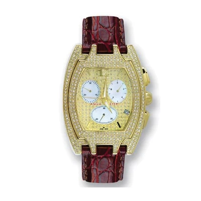 Luxurious Aqua Master Iced Out Watches! This Men’s Diamond Watch by Aqua Master features 3.50 ctw of round diamonds, a yellow face with 3 mother of pearl chronograph subdials; a polished stainless steel case and a matching leather band. This versatile men’s diamond Aqua Master watch showcases a professional chronograph movement and is water-resistant to 150 FT.