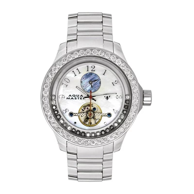 Luxurious Tourbillion Watches! This Aqua Master Tourbillion Watches Diamond Watch 5.75 Carat with floating diamonds features impressive 5.75 ctw of dazzling white and black diamonds masterfully set around the bezel, a stainless steel case with a stainless steel band and a silver dial with a mother of pearl sub dial. This diamond Aqua Master watch showcases a fine Swiss-made movement and is water-resistant.