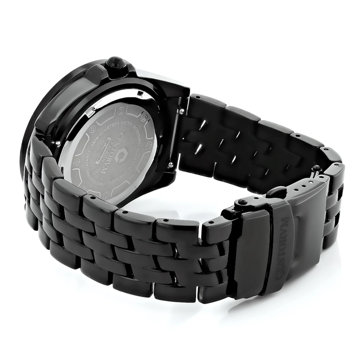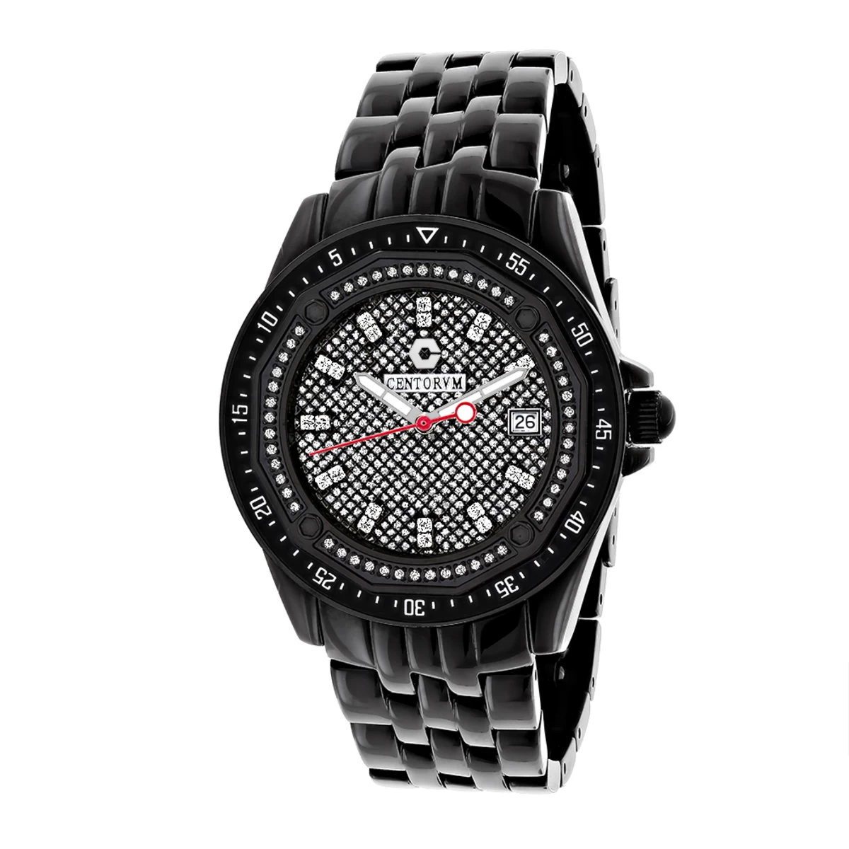 This Black Centorum Diamond Watch for Men – Midsize Falcon – features a unique design and 0.5 carats of genuine diamonds, masterfully set on the rotating bezel of the black tone stainless steel case. This Centorum timepiece is a great watch with a beautiful face. This Centorum diamond watch showcases a black dial paved with sparking stones, a date display window at the 3 o’clock position, and a black tone stainless steel band; the case is water-resistant to 30m (100ft). All Centorum diamond watches come with a 1 year warranty and are beautifully packaged, ready for gift-giving.