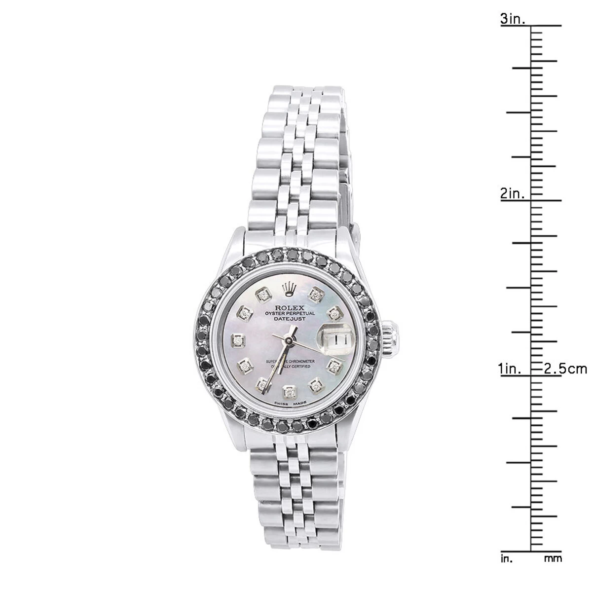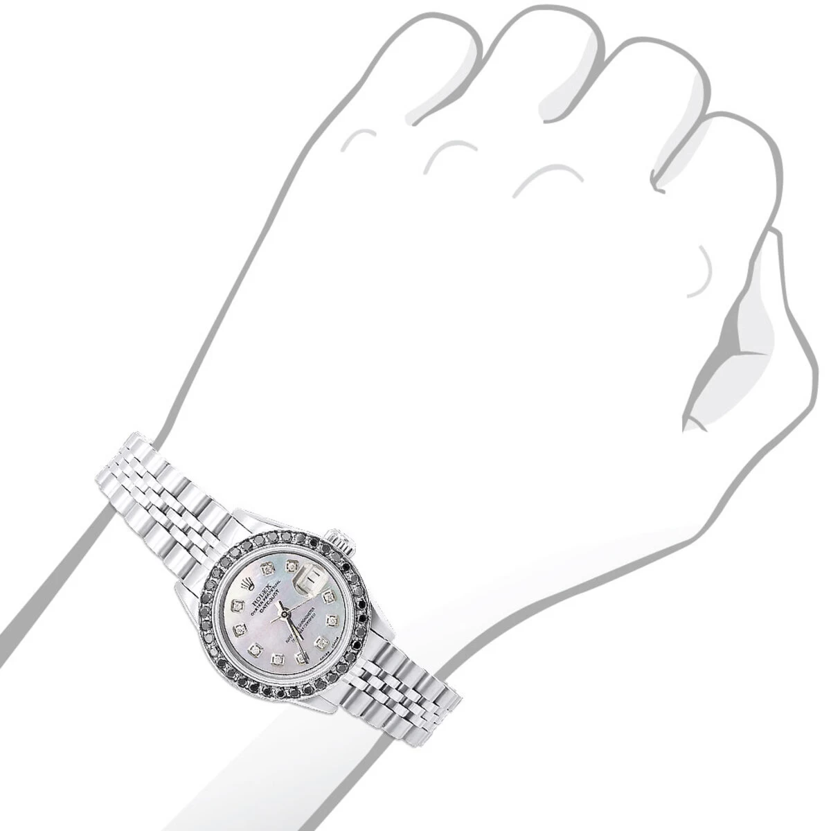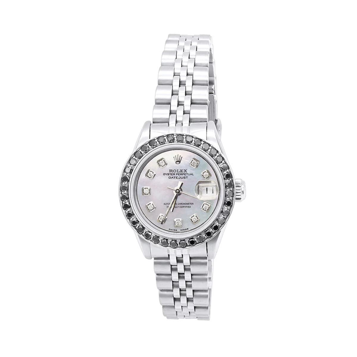 This watch is from our diamond watches for women collection. This black diamond bezel women’s Rolex oyster perpetual Datejust watch is a popular 26mm Rolex Watch with a white MOP Dial featuring a stainless steel case and a stainless steel Jubilee bracelet. The watch is very elegant with its mother of pearl iridescent dial complemented with a custom one-row black diamond incrusted bezel which is made to stand out. The dial is also decorated with 10 diamonds on hour markers and has a date window at the 3 o’clock position. Such a sophisticated timepiece will go perfectly well with any outfit and will make a wonderful gift for your loved one or yourself. This custom Rolex Ladies Watch is pre-owned, in like new condition, includes a box, and comes with a 5-year warranty from ItsHot.com.