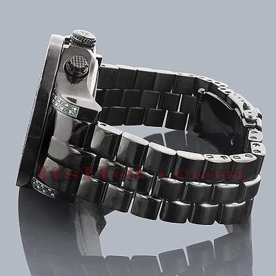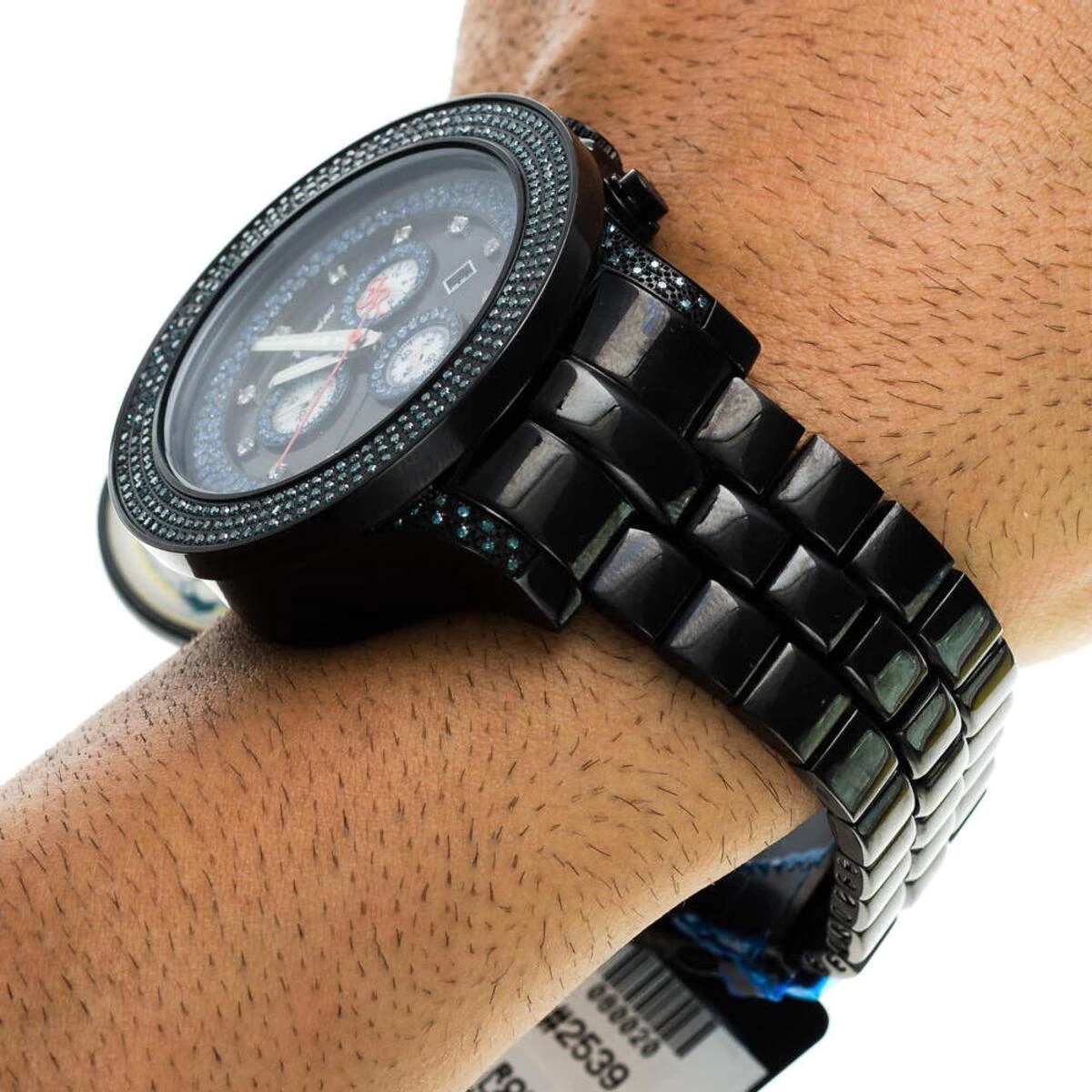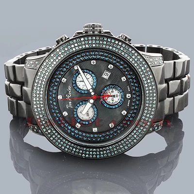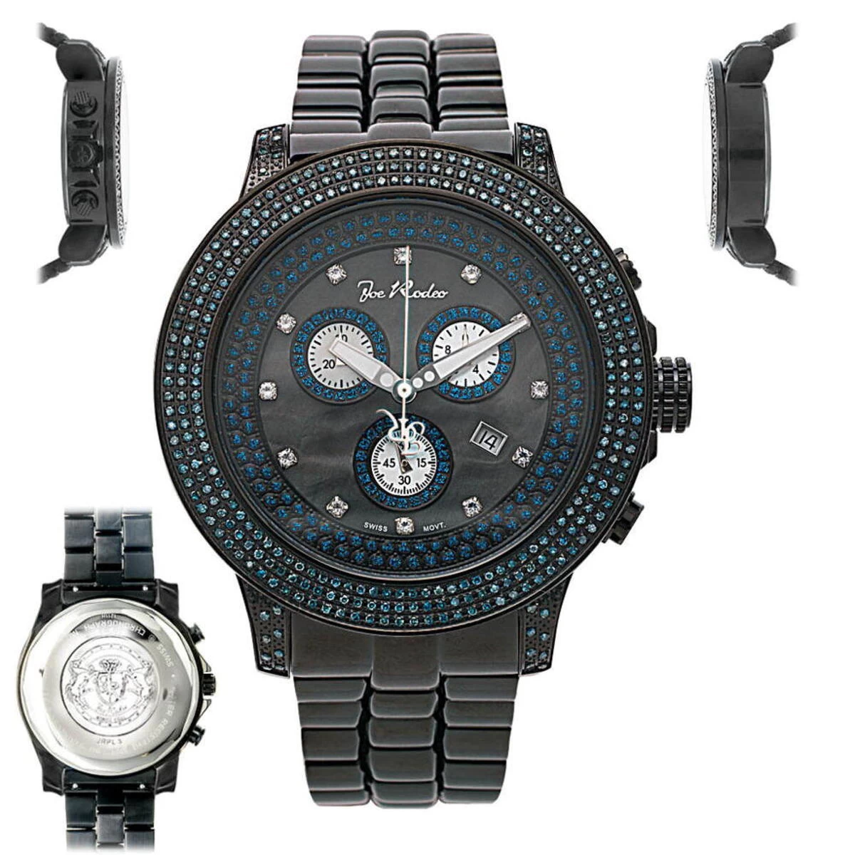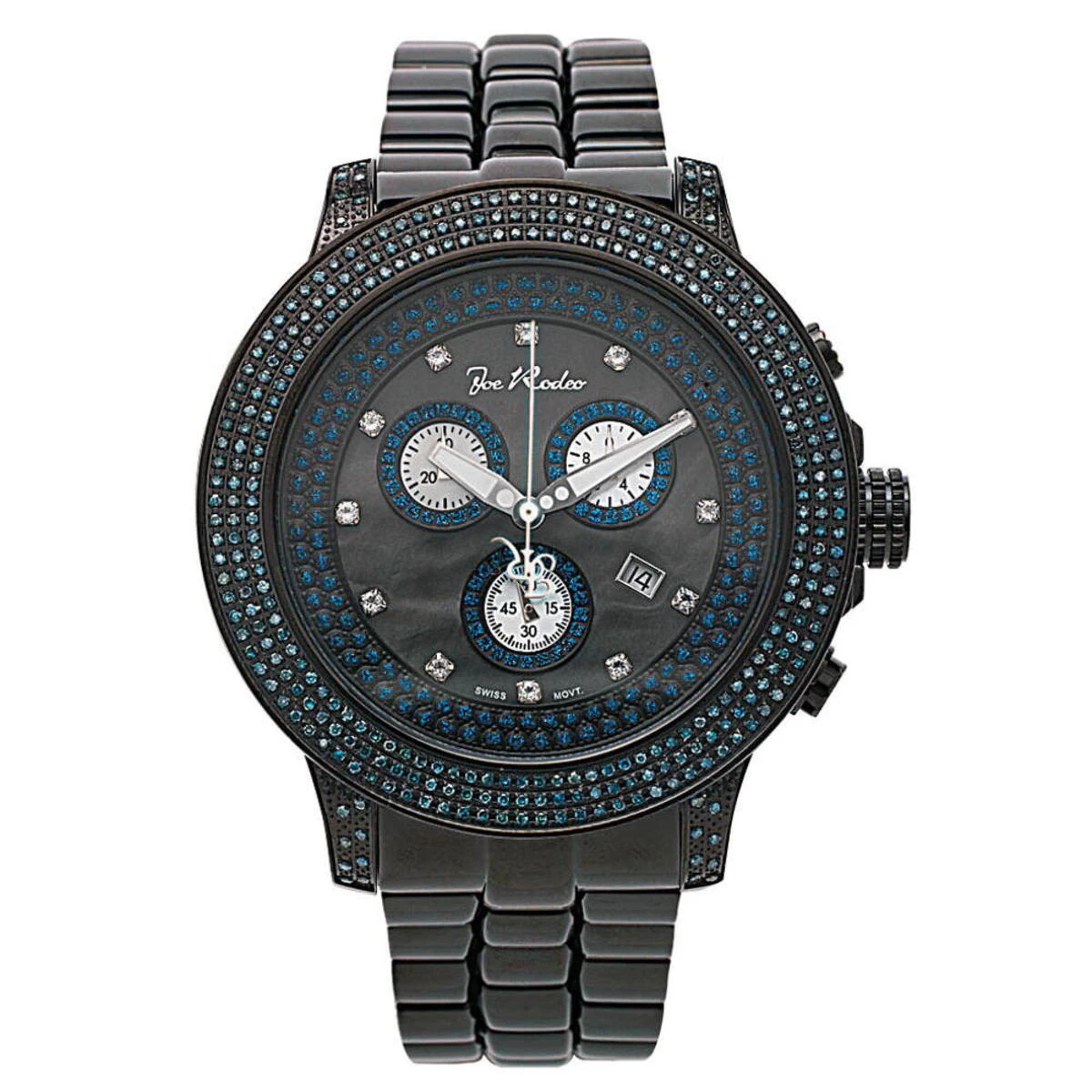 Unique Blue Diamond Watches: This Joe Rodeo Pilot Men’s Watch features 3.15 carats of sparkling blue diamonds on the bezel and on the lugs of the black tone stainless steel case. This exquisite Joe Rodeo diamond watch showcases a black mother of pearl dial paved in sparkling blue stones with three chronograph subdials, a date display window at the 4 o’clock position and a black tone stainless steel and. This luxurious men’s diamond watch by Joe Rodeo is equipped with a super accurate Swiss-made chronograph quartz movement. The case is water-resistant to 100m (330 ft).