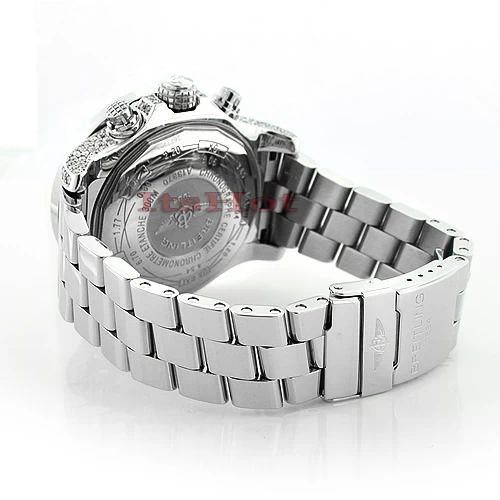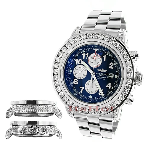 This Custom Men’s Breitling Aeromarine Super Avenger Diamond Watch features 14.12 carats of genuine diamonds on the bezel and the lugs of the silver tone stainless steel case; and a silver tone stainless steel band. This Breitling men’s diamond watch showcases a black dial with three chronograph subdials and a date display window at the 3 o’clock position.