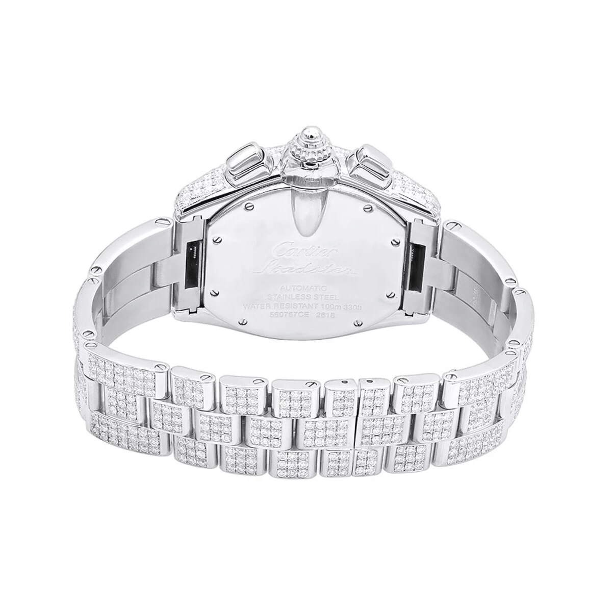 This Custom Cartier Roadster Diamond Watch for Men is pre-owned, in excellent condition, and features 17.99 carats of dazzling genuine diamonds on the stainless steel case, a polished silver stainless steel band fully paved with diamonds, chronograph function, sapphire crystal, black dial, Roman numerals, steel double adjustable deployment buckle, mechanical movement with automatic winding Cartier caliber 8510, calendar aperture at 3 o’clock, water-resistant to 100 meters / 330 feet.