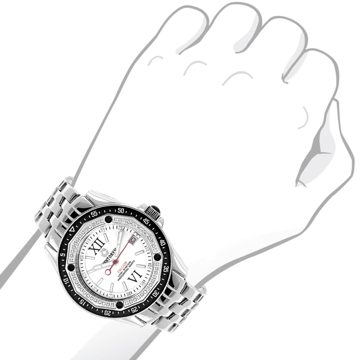 This Midsize Centorum Falcon Diamond Watch features a unique design and 0.5 carats of genuine diamonds masterfully set on the rotating black tone bezel of the silver tone stainless steel case. This Centorum timepiece is a great watch with a beautiful face. The white mother of pearl dial showcases a date display window at the 3 o’clock position, the case is water-resistant to 30m (100ft). All Centorum diamond watches come with a 1 year warranty and are beautifully packaged, ready for gift-giving.