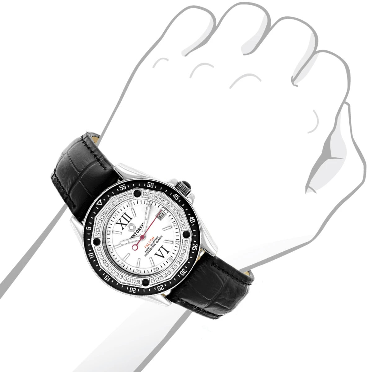 This Centorvm Falcon Diamond Watch features 0.50 carats of genuine diamonds, masterfully set on the rotating black tone bezel of the silver tone stainless steel case, and a black leather band. This Centorvm timepiece is a great watch with a beautiful face. The white mother of pearl dial showcases a date display window at the 3 o’clock position. All Centorum diamond watches come with a 1 year warranty and are beautifully packaged, ready for gift-giving.