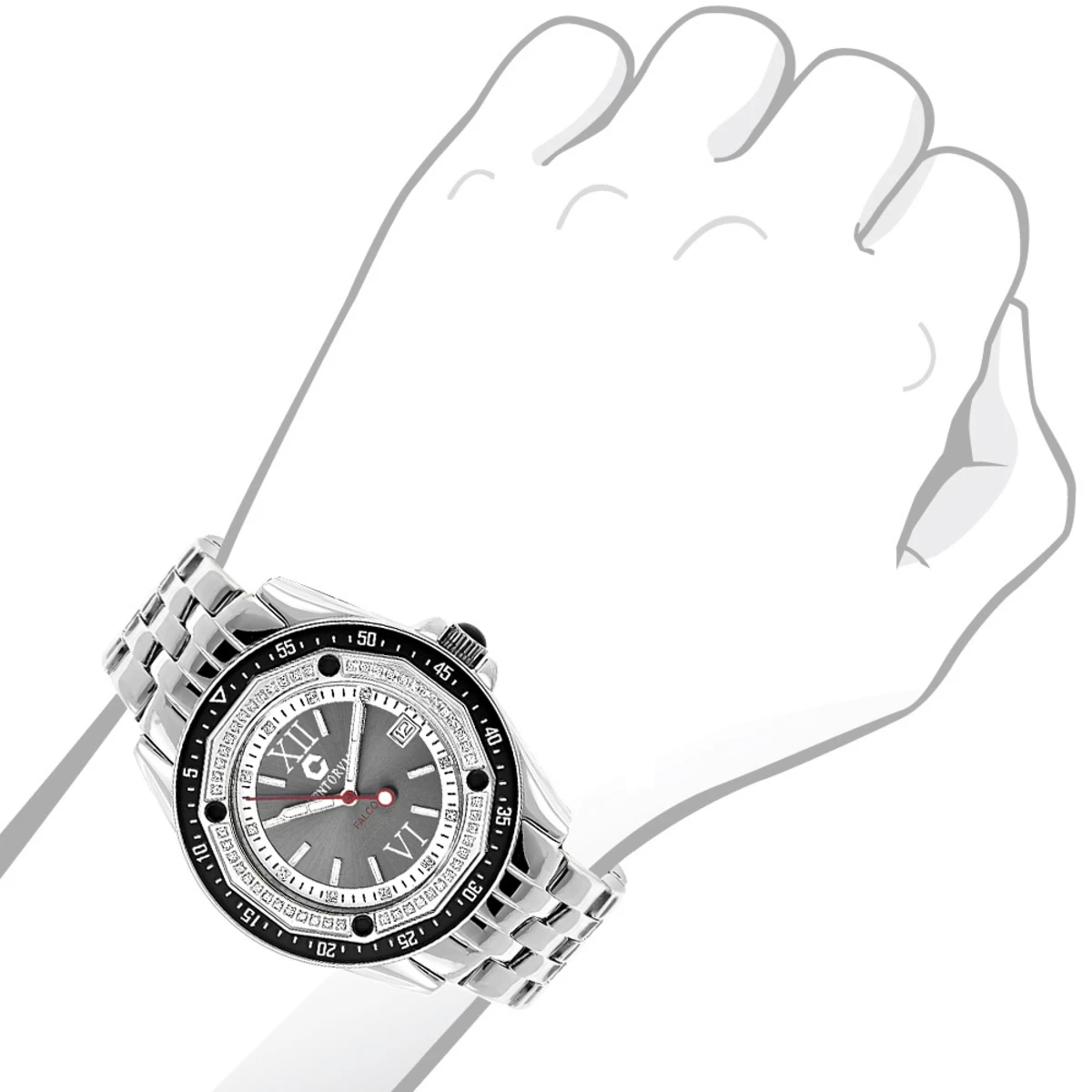 Designer Watches: This Centorum Diamond Watch – Midsize Falcon – features a unique design and 0.50 carats of genuine diamonds, masterfully set on the rotating bezel of the silver tone stainless steel case. This Centorum timepiece is a great watch with a beautiful face. A metallic dial showcases a date display window at the 3 o’clock position. All Centorum diamond watches come with a 1 year warranty and are beautifully packaged, ready for gift-giving.
