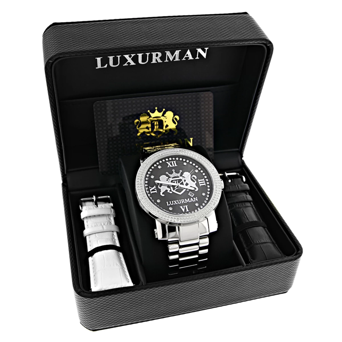 Designer Large Watches: This Luxurman Phantom Real Diamond Watch for Men features 0.12 carats of genuine diamonds, a stainless steel case with a stainless steel band, and a black mother of pearl face with distinctive Luxurman Logo. This LUXURMAN men’s diamond watch showcases a fine Japan-made quartz movement and is water-resistant to 30m (100ft). Brand new watch, with full 5 year manufacturer’s warranty, retail box and two extra leather bands in different colors.