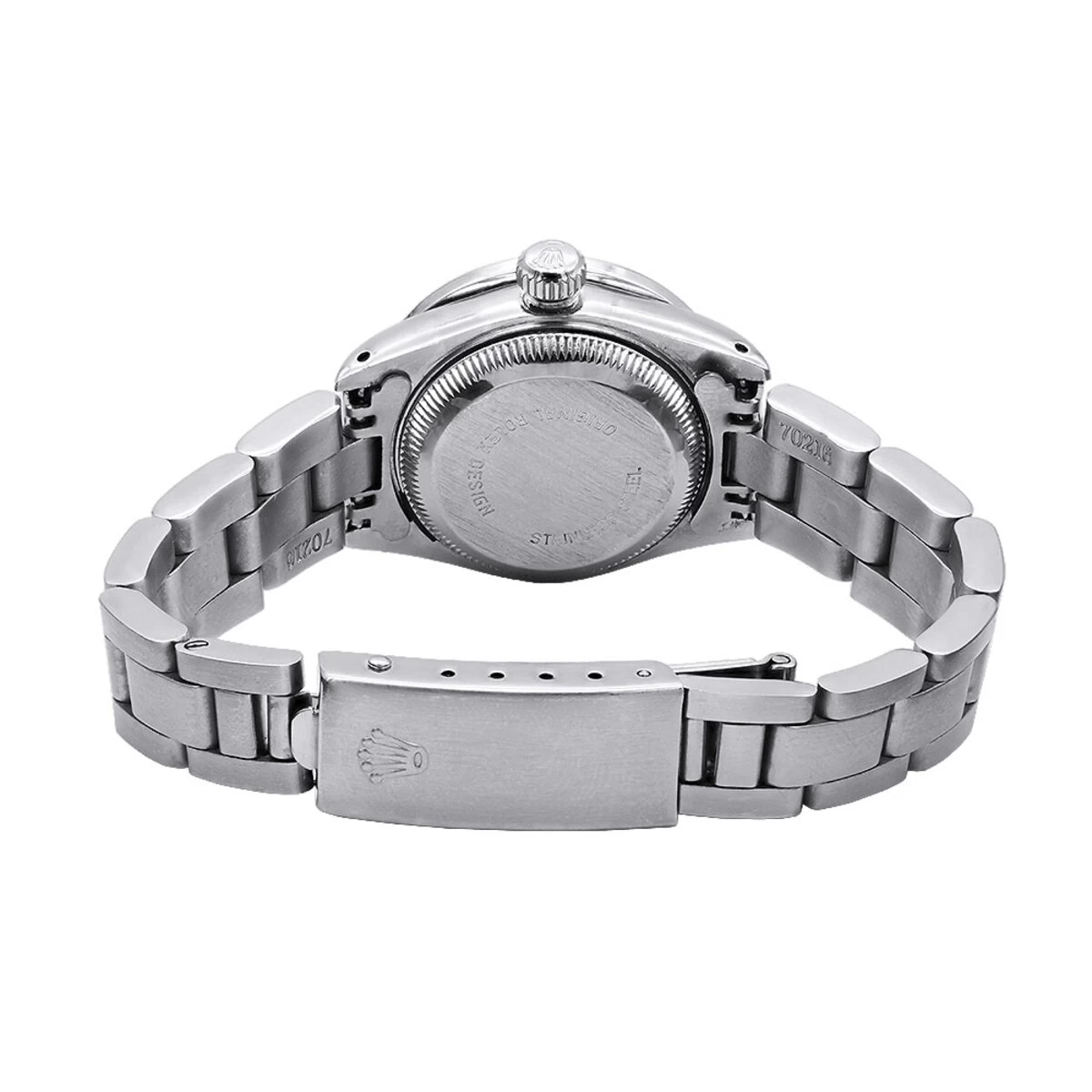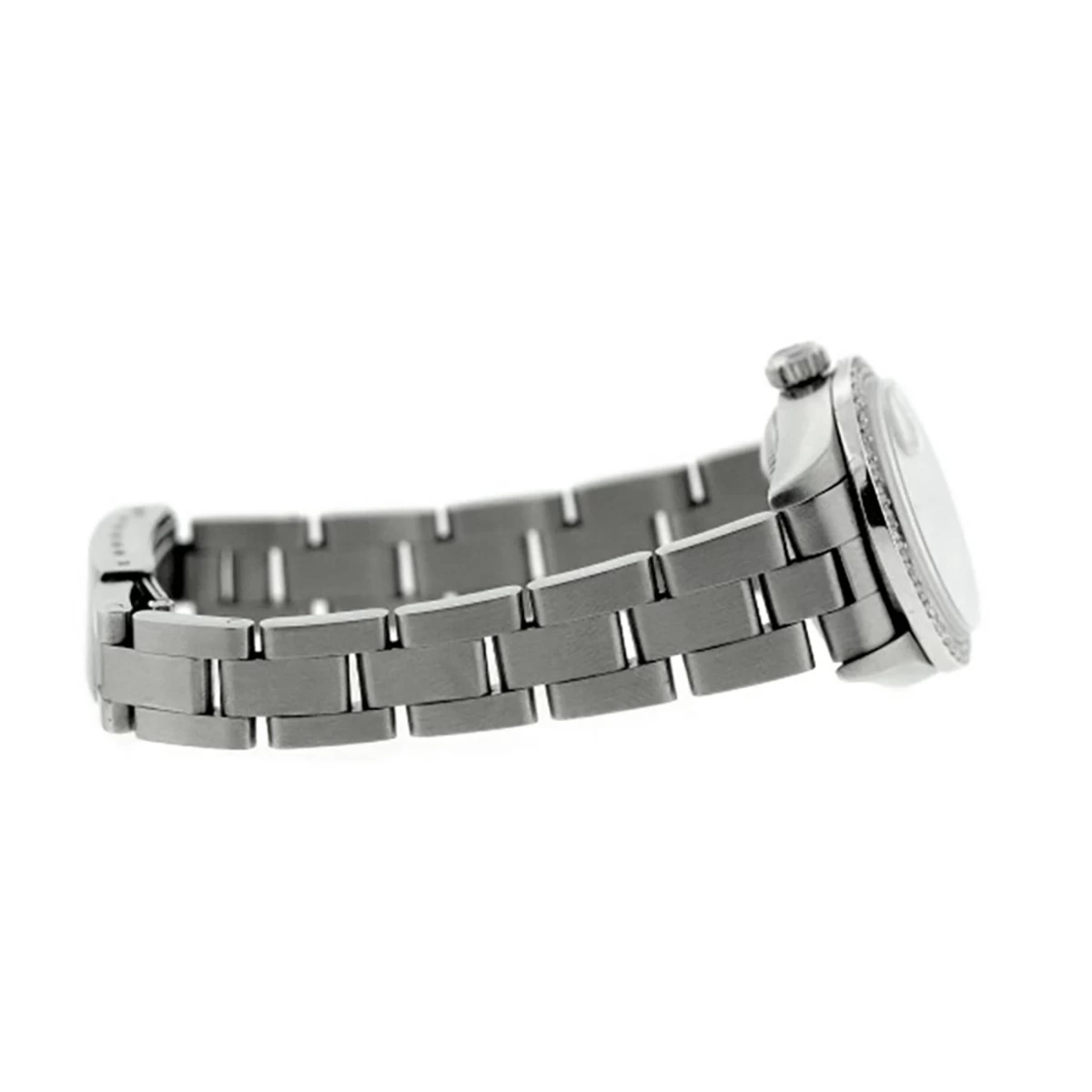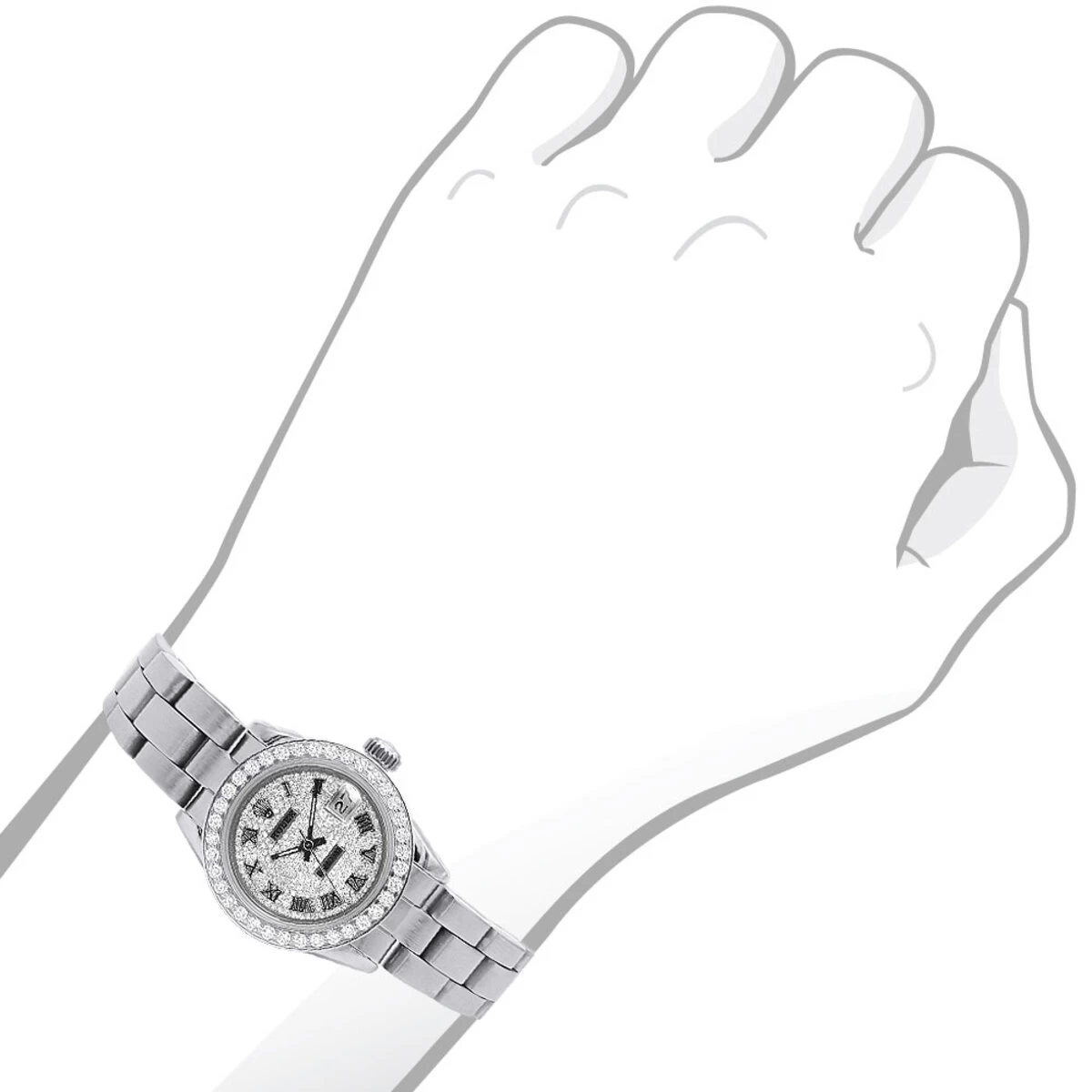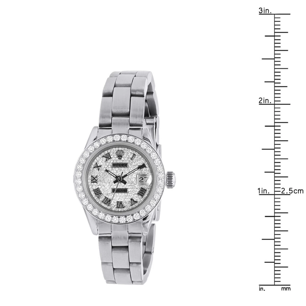 Diamond Bezel & Face Watches: This breathtaking Rolex Datejust Ladies Diamond Watch in Stainless Steel features 2.5 carats of dazzling round cut genuine diamonds pave set on a bezel and face of the watch, a brushed stainless steel case, and a stainless steel band. This Rolex Diamond Watch for Women showcases a sparkling diamond dial and a date display at the 3 o’clock position. This custom Rolex diamond watch is pre-owned, in excellent condition, and comes with an original Rolex box and a 5-year warranty from ItsHot.com.
