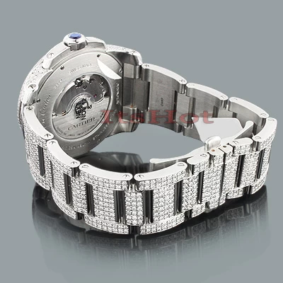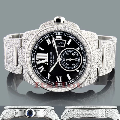 This Diamond Cartier de Calibre men’s watch customized by ItsHot.com features 27.00 carats of genuine sparkling diamonds, a polished stainless steel case, and a polished stainless steel diamond band. This Cartier Calibre Men’s Watch showcases a black dial with luminous hour markers, a date display at the 3 o’clock position, and a second subdial. Contemporary and refined, this exquisite men’s watch reinterprets the round form in watchmaking with character and style. This custom Cartier diamond watch is pre-owned in excellent condition and comes with a 5-year warranty from ItsHot.com. Luxury at its finest!