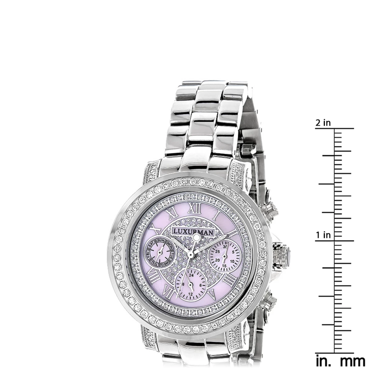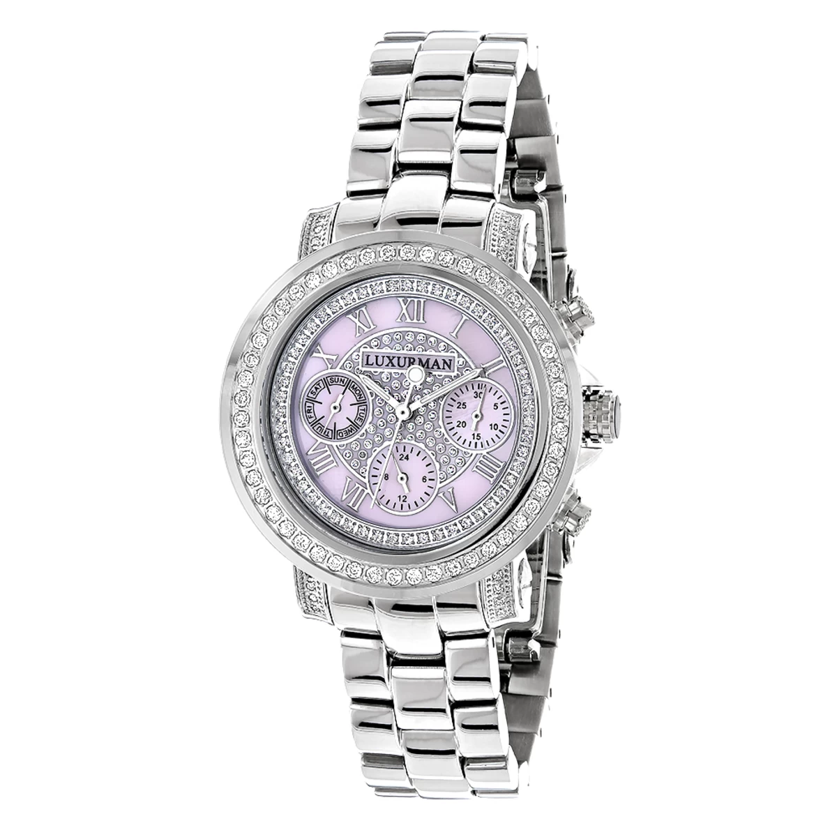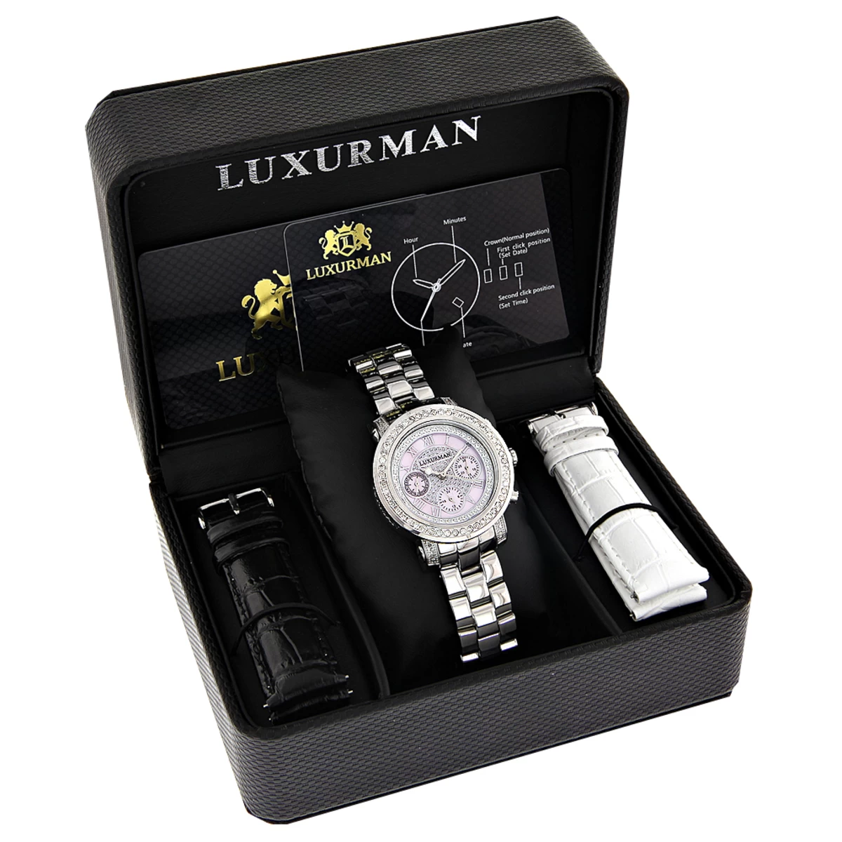 Diamond Watches For Women: This Ladies Diamond Watch Pink MOP features 2 carats of genuine diamonds masterfully set on the bezel and lugs of the silver tone stainless steel case. The pink mother of pearl dial has three subdials and is paved in white stones. This diamond watch by Luxurman comes with two extra interchangeable straps in different colors. Water-resistant to 30 m (110 ft). This Luxurman Diamond watch is a perfect present for any occasion.