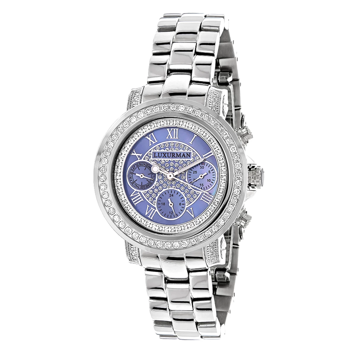 Ladies Diamond Watches: this Luxurman Montana Blue MOP Watch features 2 carats of genuine diamonds masterfully set on the bezel and lugs of the silver tone stainless steel case. The bluel dial has three chronograph subdials and is paved in white stones. This diamond watch by Luxurman comes with two extra interchangeable straps in different colors and makes a perfect gift for any occasion.