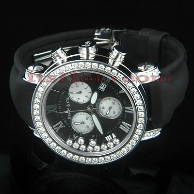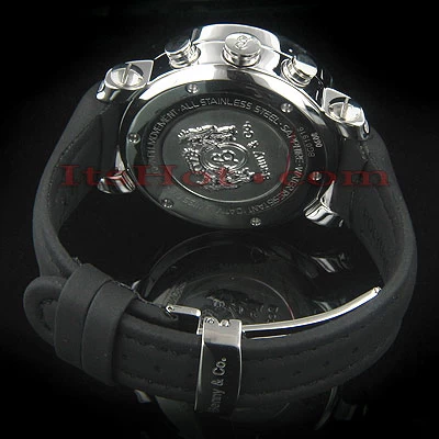 This Floating Diamond Watch by Benny Co features a round 45mm (1.8 inch) polished stainless steel case, sapphire crystal glass, individually numbered and engraved stainless steel case-back. The watch showcases fine white VS-quality full Belgian-cut diamonds around the bezel, on the lugs and inside the dial totaling 4.0 carats. Full color dial with three natural color mother-of-pearl sub dials and applied Roman numerals. Fine Swiss-made quartz movement with chronograph function, center second, and date. This iced out watches collection piece by Benny and Company Watches comes with three extra interchangeable rubber straps and one leather strap, all with engraved butterfly clasps. Water-resistant to 100m.