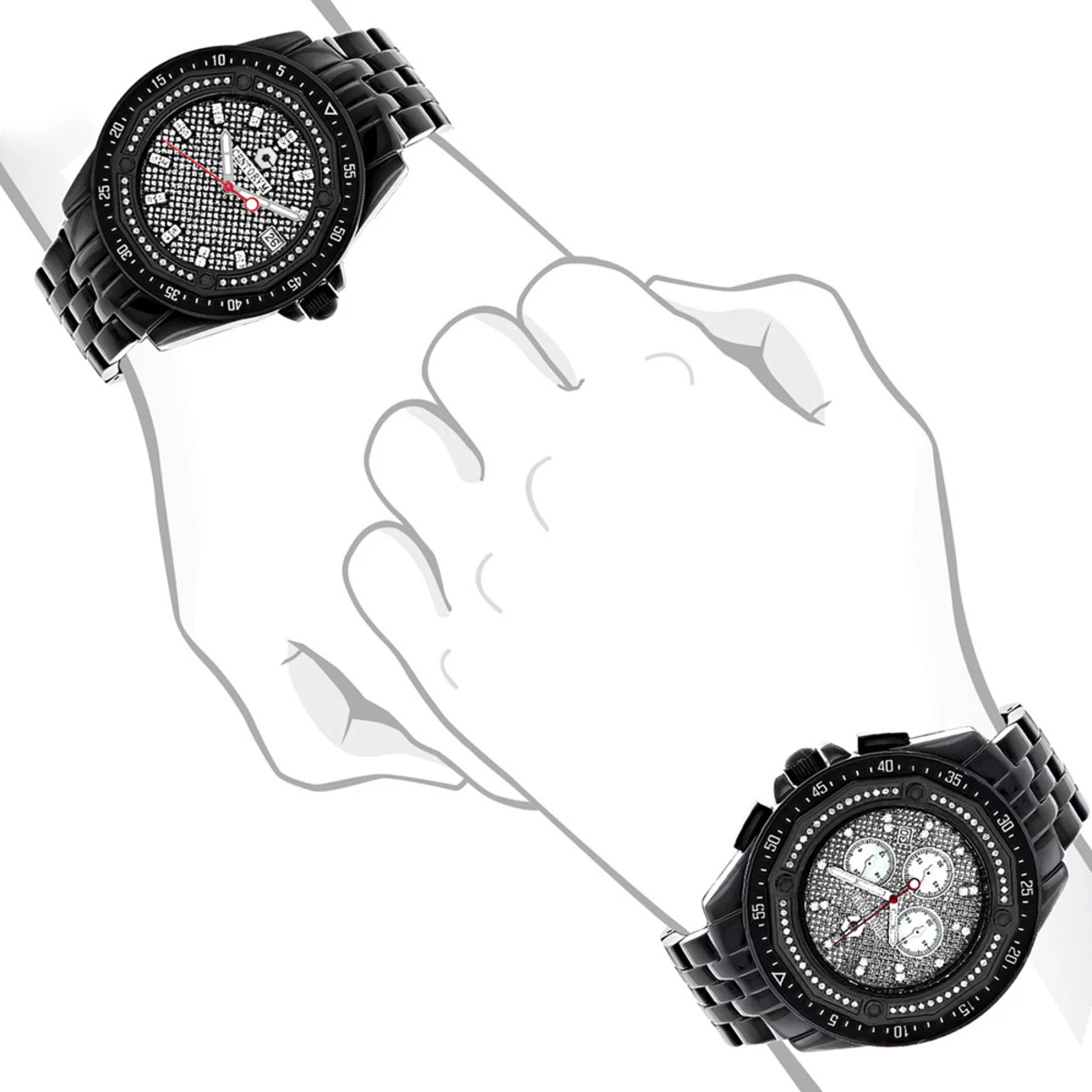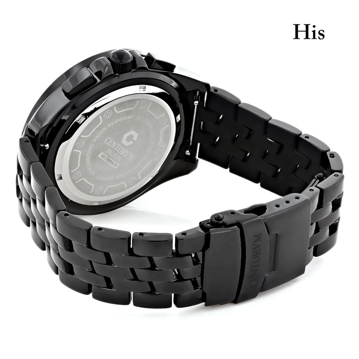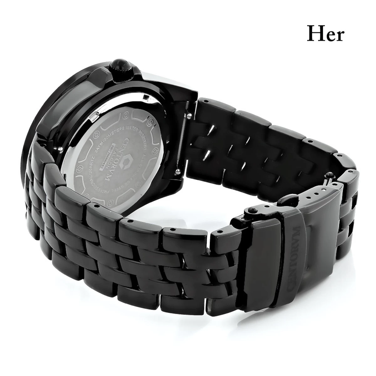 His and Hers Watches collection: this Centorum Chronograph Diamond Watch Set in black features unique design and 1.05 carats of genuine diamonds, masterfully set on the rotating black tone bezel of the black stainless steel case. Both of these diamond watches are conveniently water-resistant to 30m(100ft) and come with 1 year warranty. The Women’s Diamond Watch features 0.5 carats of genuine diamonds and has a black dial paved with sparking stones which showcases a date display window at the 3 o’clock position; The Men’s Diamond Watch showcases 0.55 carats of genuine diamonds, paved dial with three chronograph subdials, date display window at the 4 o’clock position, and black tone stainless steel band. This diamond watch set comes in full retail packaging and is ready for gift-giving.