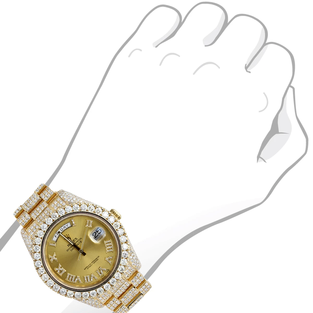 Iced Out Rolex Watches: custom Rolex Day-Date 18k Gold Watch (also known as Rolex President or Rolex Presidential watch) has a 40mm 18k yellow gold case set with high-quality VS diamonds, also has a diamond bezel set with larger diamonds, and features a yellow dial with roman numerals also paved in diamonds. This amazing men’s watch also comes with a President bracelet paved in diamonds. This Rolex President Gold Watch is paved with a total of 21 carats of dazzling high-quality diamonds. The watch comes in an original box with papers, in like new condition. 5-year warranty provided by ItsHot.com