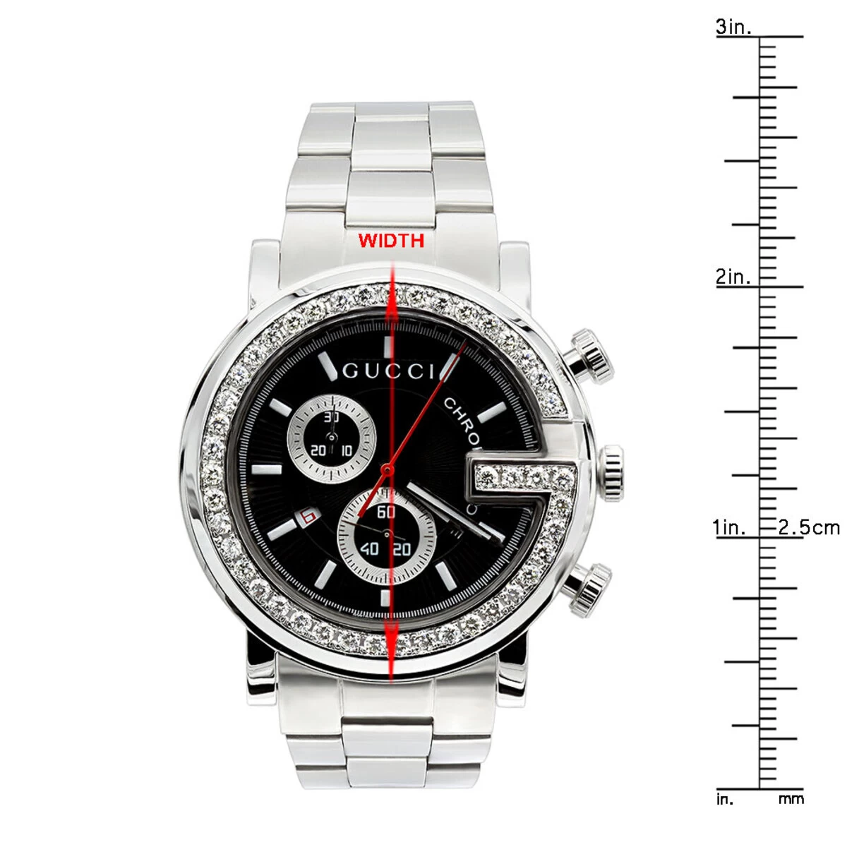 This Iced Out Gucci Chrono Diamond Watch for Men (101M G Watch) is paved in 2 carats of genuine diamonds, each masterfully set around the bezel. This men’s diamond watch features a black face with two chronograph subdials, a date display at 8 oclock, a silver tone stainless steel case and the band. Fine Swiss-made quartz movement with chronoscope function, day and date. Water-resistant 30m (100 ft).