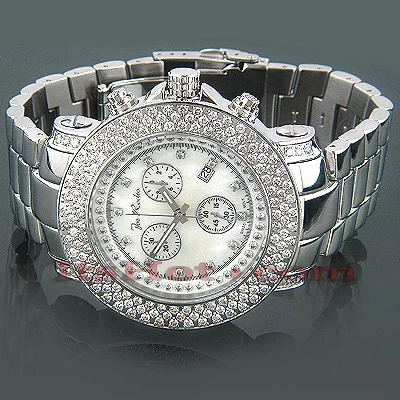 JoJo Iced Out Watches! This Joe Rodeo diamond watch features genuine round diamonds masterfully set on the bezel and lugs totaling 6.00 ct. The white mother of pearl face features three chronograph subdials and a date display window at 4 o’clock position. 10 ATM water-resistant stainless steel case houses a fine Swiss-made quartz movement with chronograph function, center second and date. This men’s Joe Rodeo diamond watch comes with two extra interchangeable straps in different colors. The patented strap adjusts once for a perfect fit, and comes on and off with the press of a button.