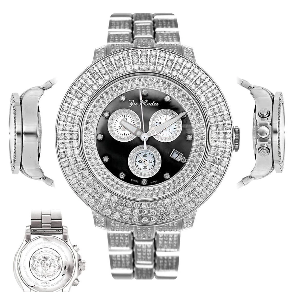 Affordable Iced Out Watches! This Joe Rodeo Pilot Diamond Watch features a huge 55mm silver gold stainless steel case with 11.00 ctw of round sparkling diamonds set on its bezel, lugs and the band. The black mother of pearl face has three chronograph subdials, a date display window at 4 o’clock position and glistening white stones set as hour markers. This Joe Rodeo watch is equipped with a super accurate Swiss-made chronograph quartz movement and is water-resistant 100m (330 ft).