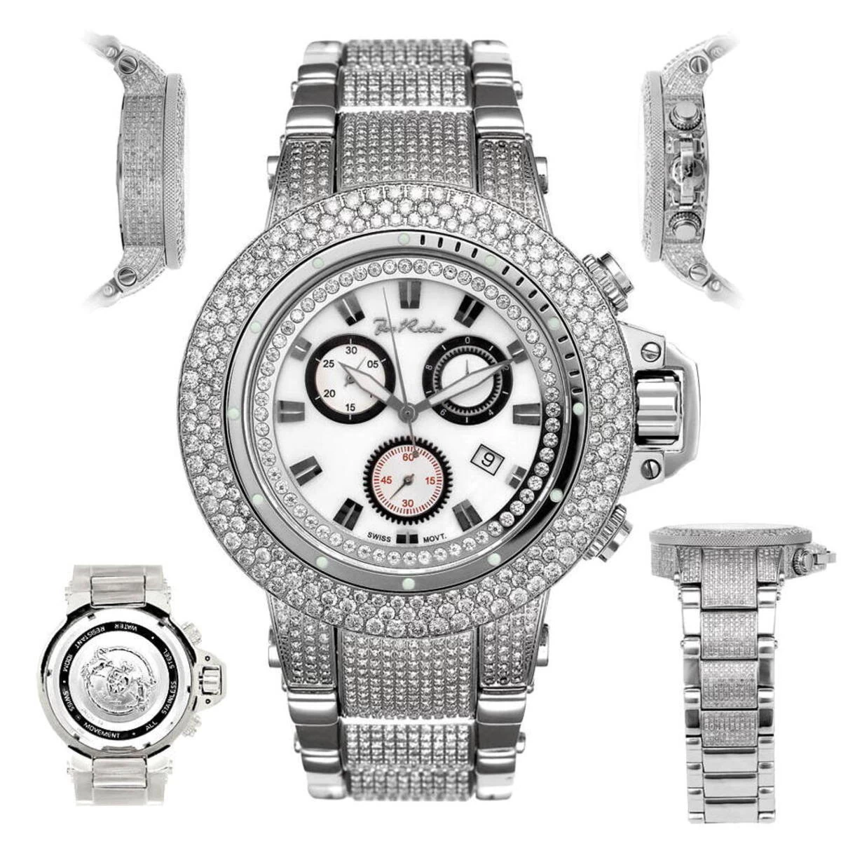Luxurious iced out watches! This Joe Rodeo Razor diamond watch features 24.00 carats of beautiful genuine diamonds on the bezel, sides and lugs of stainless steel case and diamond stainless steel band. The white mother of pearl dial with three chronograph subdials, unique date display window at 12 o’clock position and a row of glistening white stones around it is protected by a scratch-free crystal glass. This luxurious men’s diamond watch by Joe Rodeo is equipped with a super accurate Swiss-made chronograph quartz movement. The case is water-resistant 100m (330 ft).