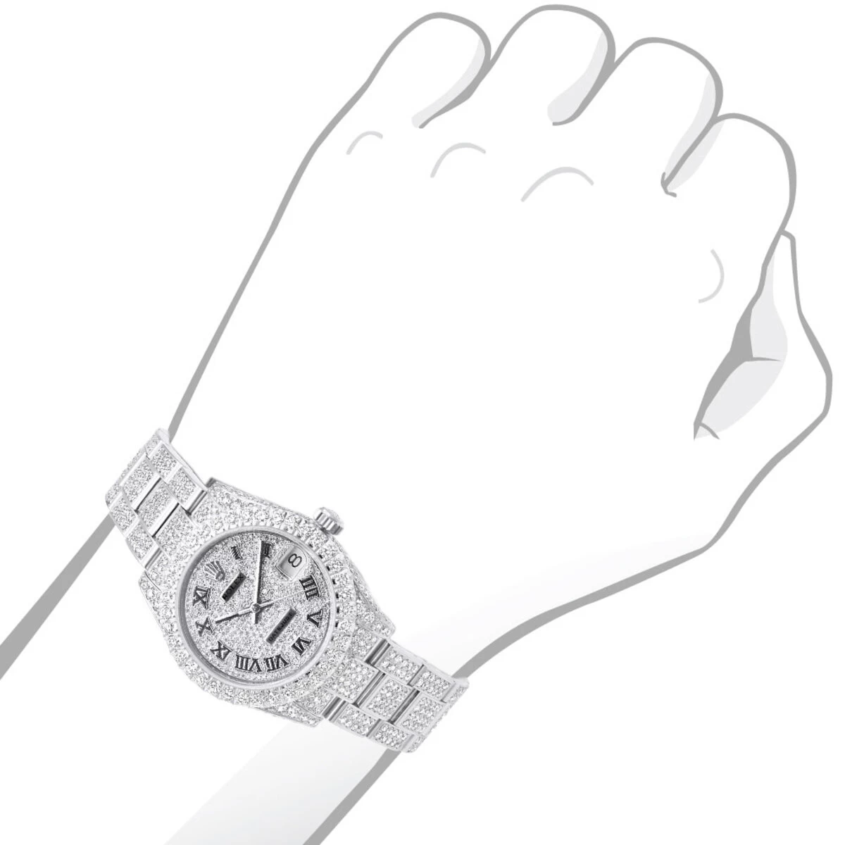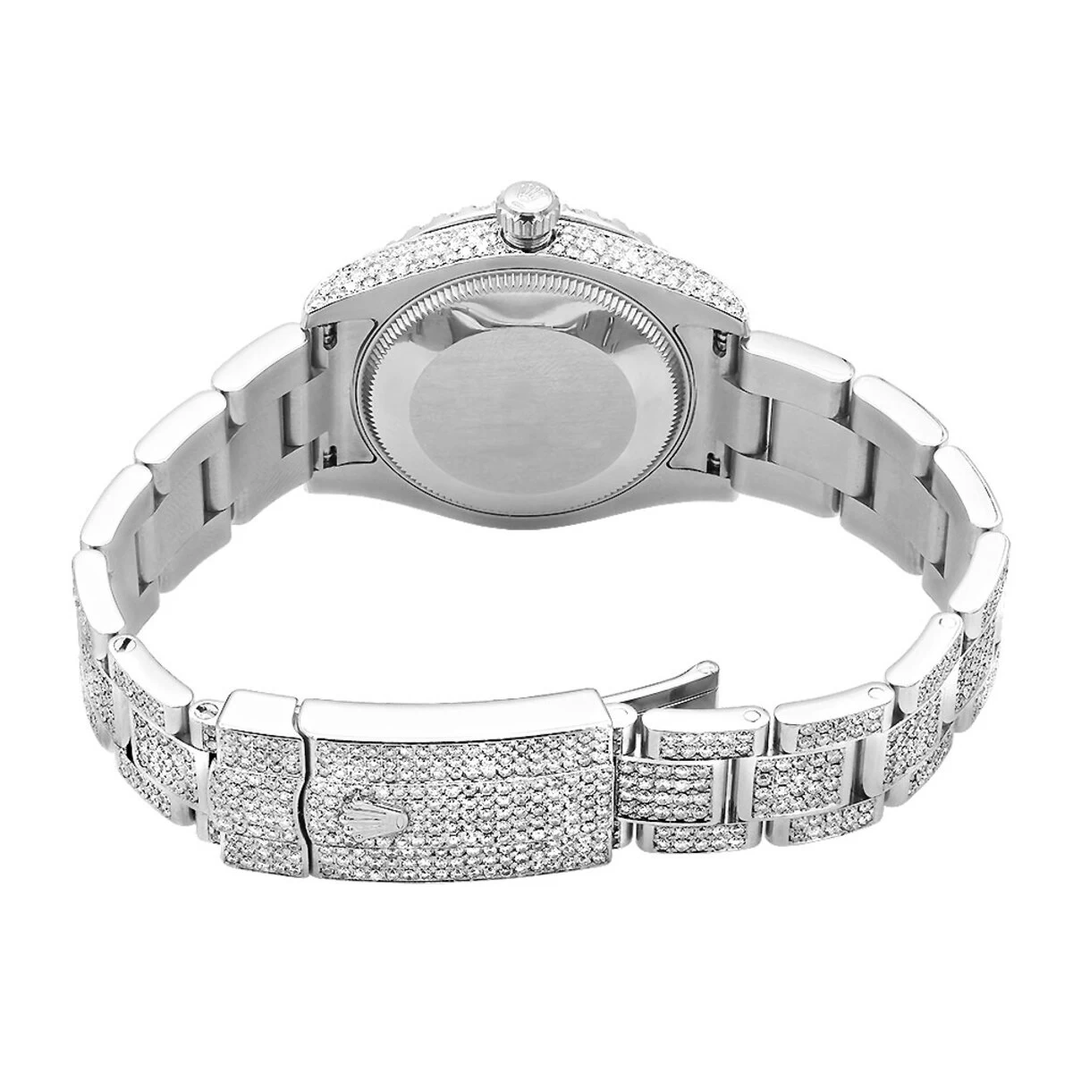 Iced-Out Watches: This Pre-Owned Ladies Diamond Rolex Datejust Watch is an old-time classic now decorated with a custom set of 12 carats of diamonds on the stainless steel case, bracelet, and even face.