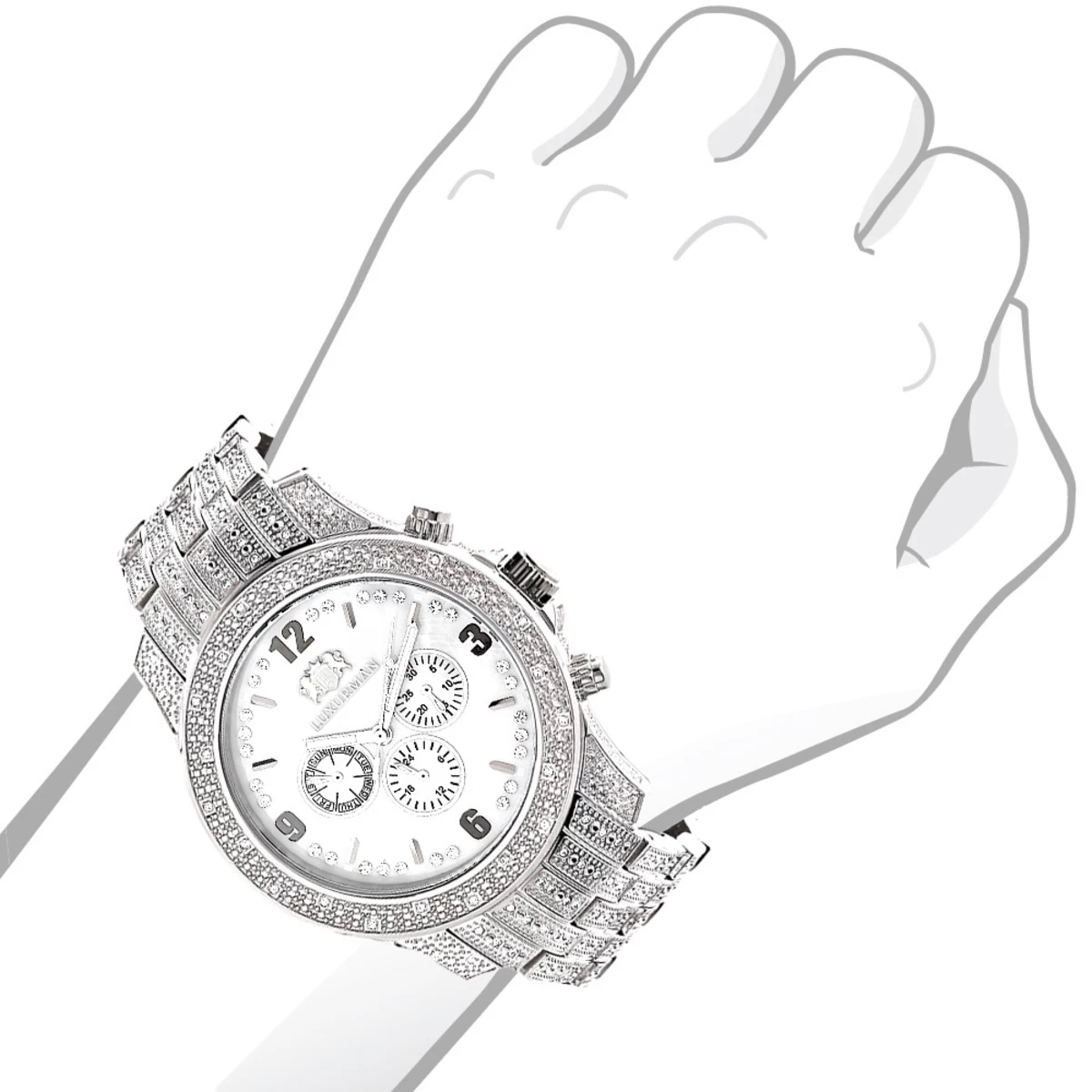 This Iced Out Luxurman Men’s Diamond Watch White MOP features 1.25 carats of round diamonds masterfully set on the bezel, sides, lugs and the band of this silver stainless steel watch. This Luxurman diamond watch showcases a luxurious mother of pearl dial and Date/Calendar/24 hours subdials. This men’s diamond watch is water-resistant to 30 m (110 ft) and comes with two interchangeable straps in different colors.