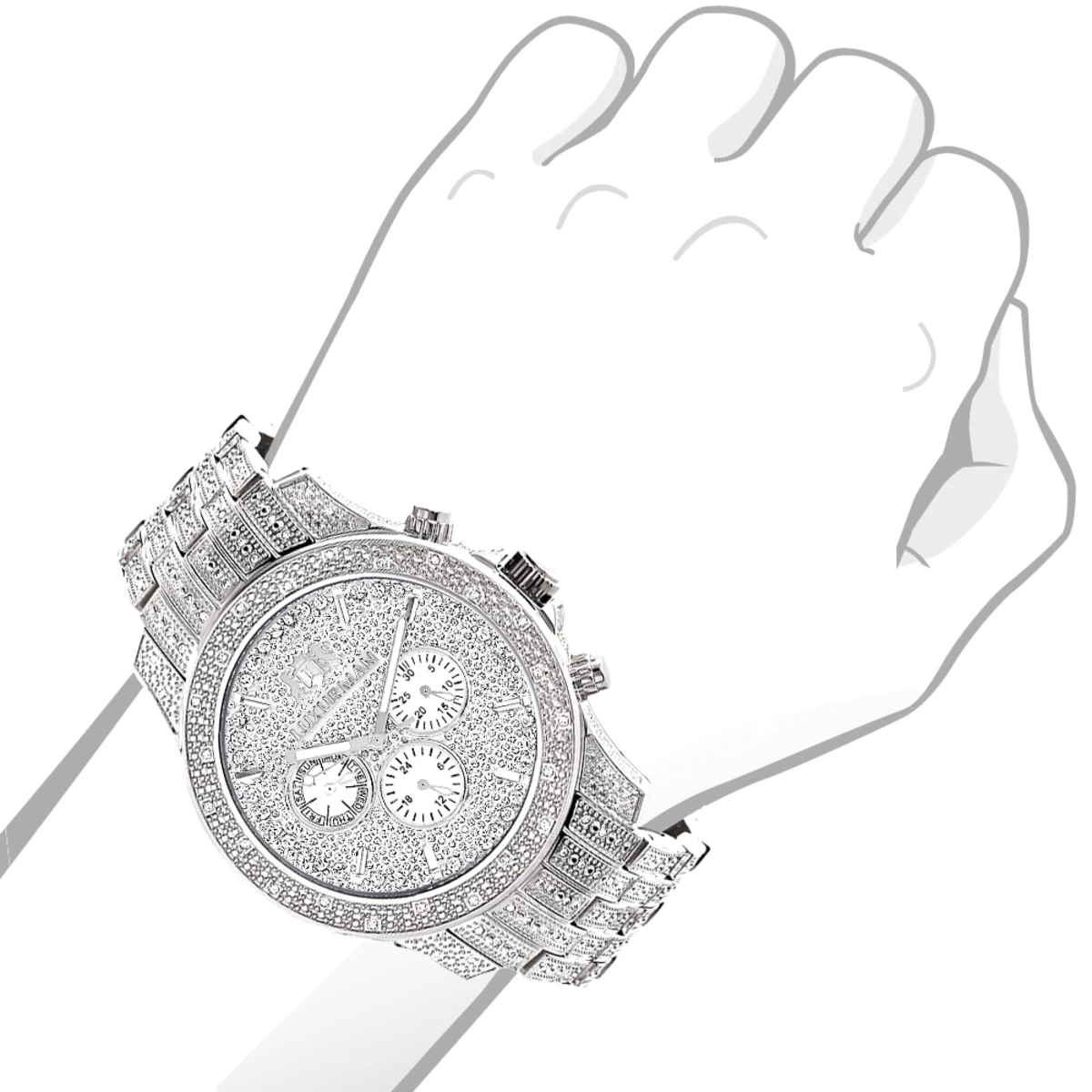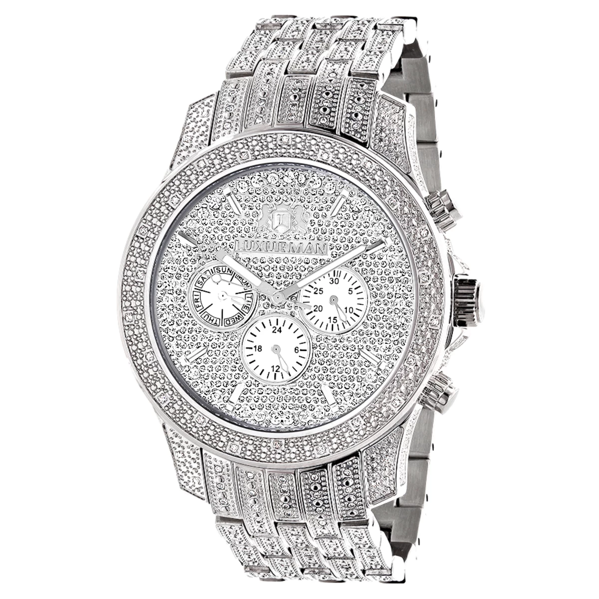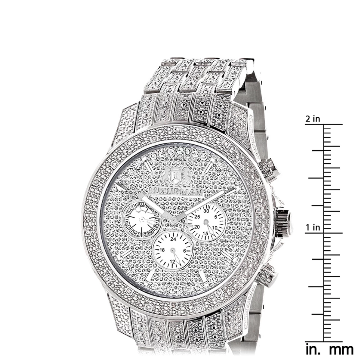 Affordable Iced Out Watches! This Luxurman Men’s Diamond Watch features 1.25 carats of round diamonds masterfully set on the bezel, sides, lugs and the band of this silver stainless steel watch. The face of this LUXURMAN wrist watch showcases three white mother of pearl chronograph subdials and a date display at 4 o’clock. This men’s diamond watch is water-resistant to 30 m (110 ft).