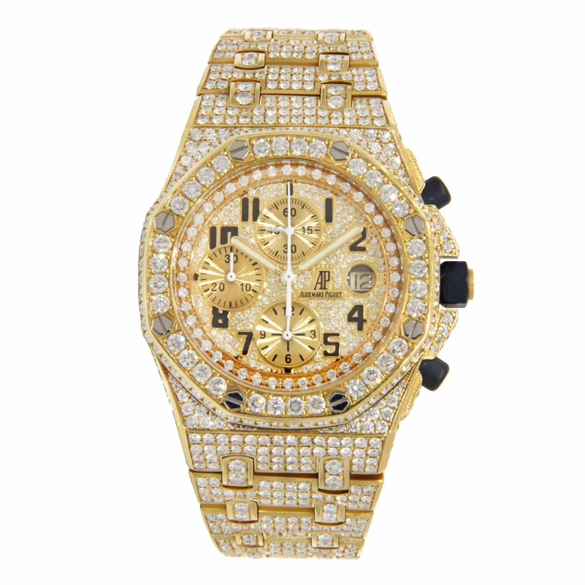 This AP Royal Oak Offshore Men’s Watch is from our men’s diamond watches and iced-out watches collections. This amazing diamond watch for men features yellow gold 42mm case with a bezel, case, dial & bracelet all covered in white sparkling diamonds totaling 28.5 carats. The watch is pre-owned and like all our pre-owned watches it was thoroughly inspected to be in like-new condition and comes with our 5-year warranty.