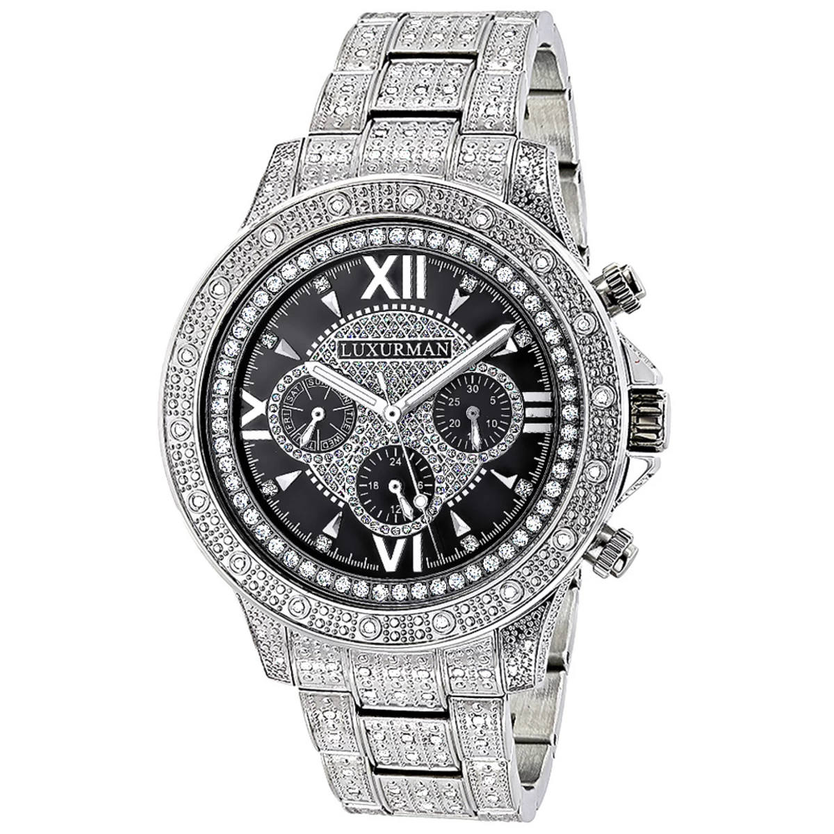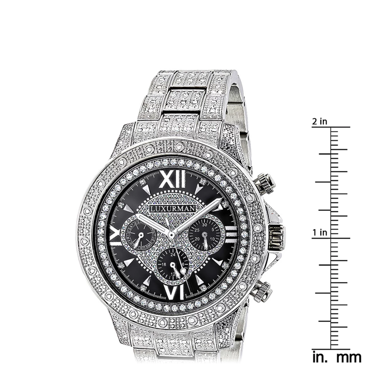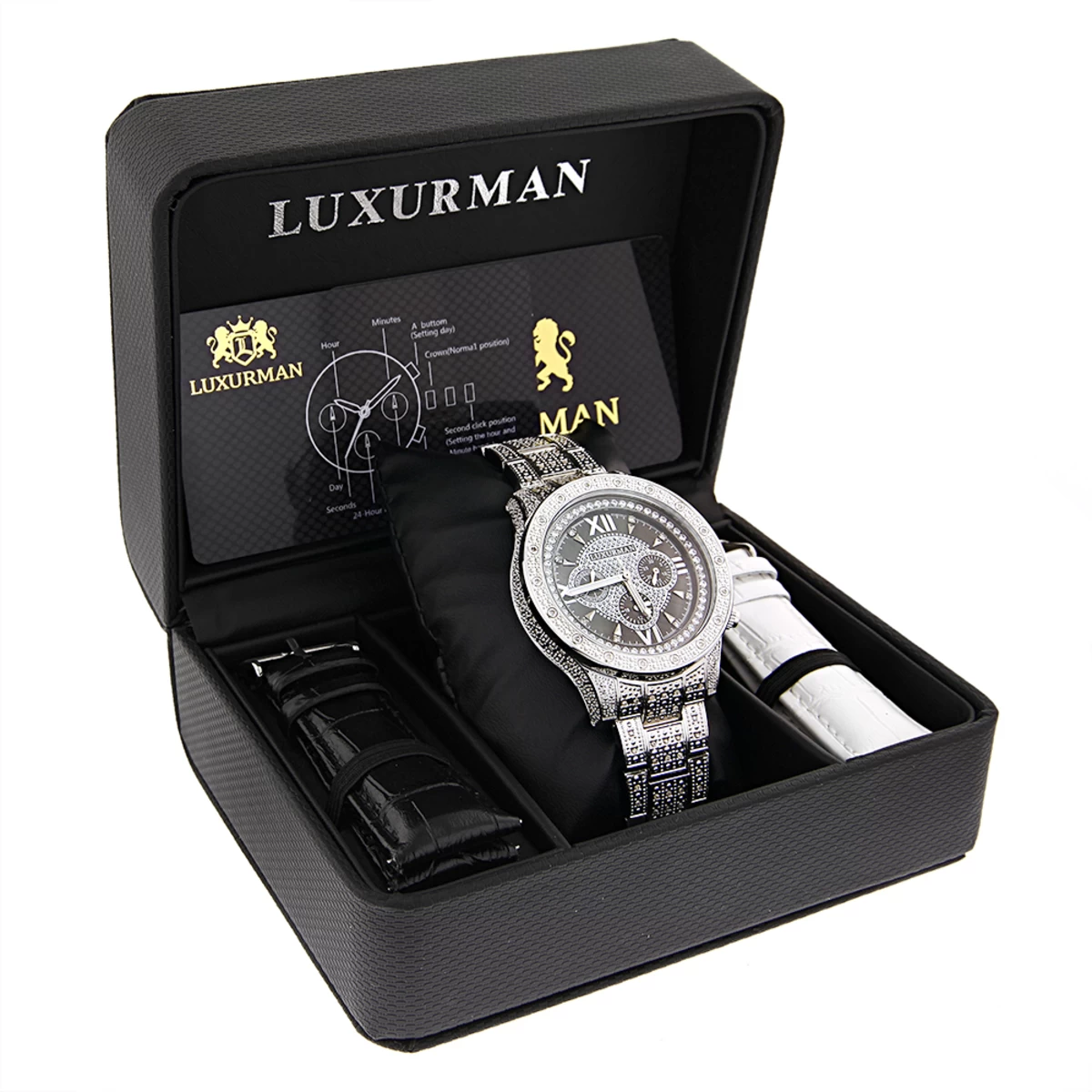 This Iced Out Men’s Watch with Diamond Band Luxurman Liberty showcases 1.25 carats of genuine diamonds masterfully set on the bezel, sides, lugs and the band of this gold plated stainless steel watch. This iced out Luxurman men’s diamond watch features a black dial with sparkling stones and three subdials. This men’s diamond watch is water-resistant to 30 m (110 ft), has a fine Japan-made quartz movement and comes with two extra interchangeable leather straps in different colors (band colors may vary).