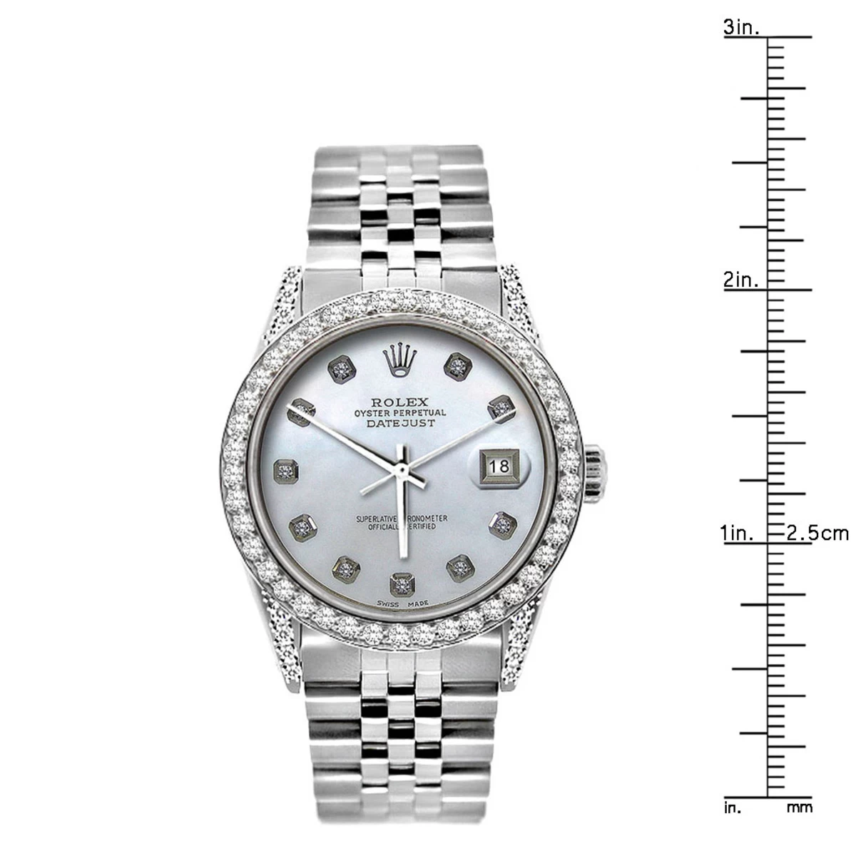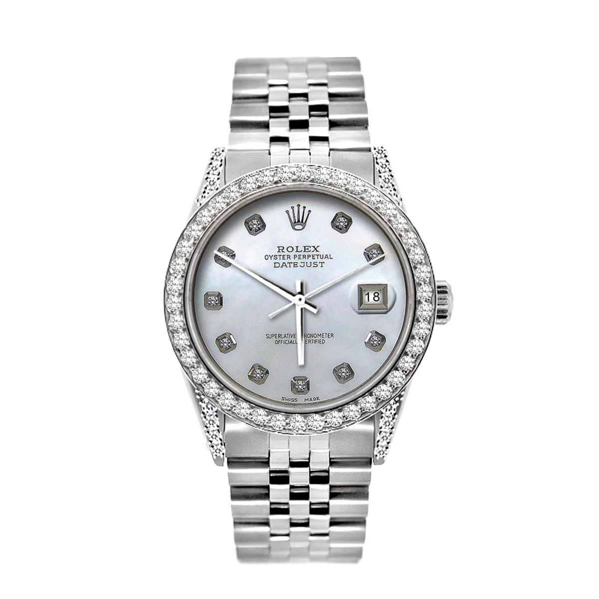 Iced out Rolex Watches: This fabulous Rolex Oyster Perpetual Datejust Men’s Diamond Watch features 5 carats of sparkling genuine round cut diamonds on the bezel and brushed stainless steel case. This Rolex Diamond Watch for Men showcases a white mother-of-pearl dial and a date display at the 3 o’clock position. Please note: this custom Rolex diamond watch is pre-owned, in like new condition, and comes with a 5-year warranty from ItsHot.com.