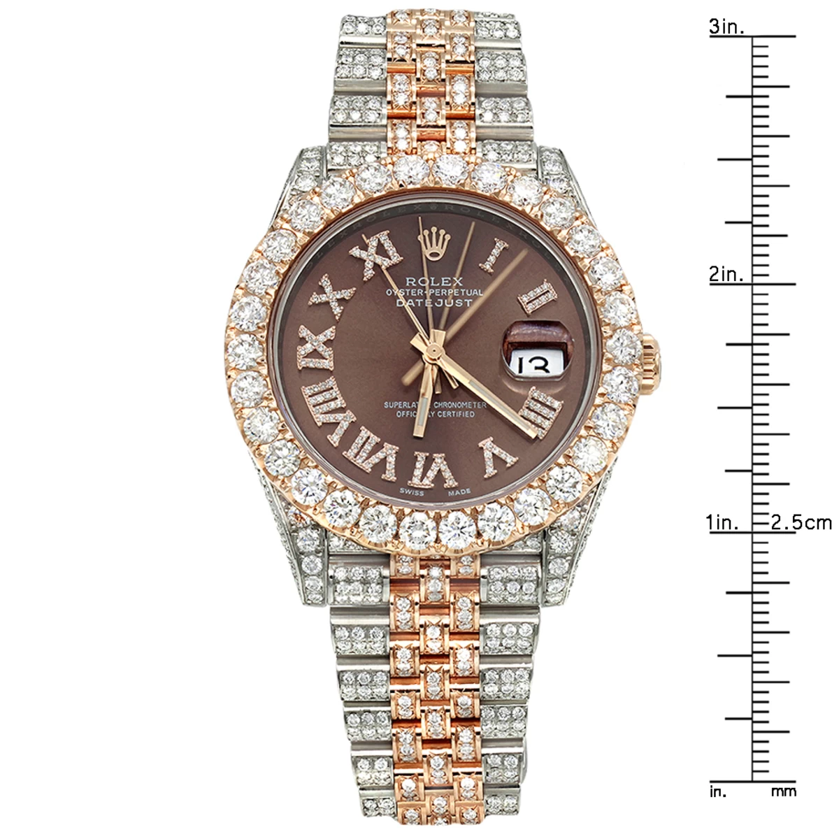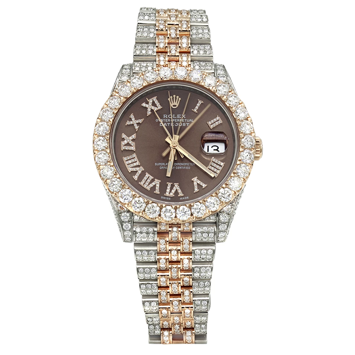 This eye-catching Iced Out Two Tone Rolex Oyster Perpetual Datejust Men’s Diamond Watch is made of solid rose gold and stainless steel and showcases 21 carats of dazzling VS/SI clarity diamonds masterfully set in a bezel, sides, dial, band, and clasp of this amazing Rolex watch. Featuring a fully iced-out look, this unique Rolex watch has an exquisite dial with roman numerals encrusted with diamonds. This Rolex watch is conveniently water resistant to 30 m (100ft). This original Rolex watch with custom set diamonds is pre-owned in excellent condition and comes in an original box with a full 5-year warranty from ItsHot.com.