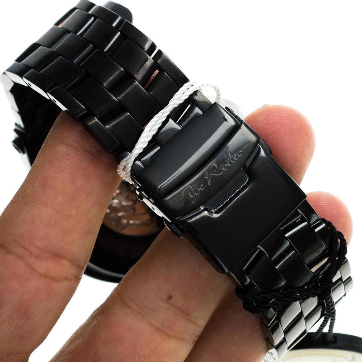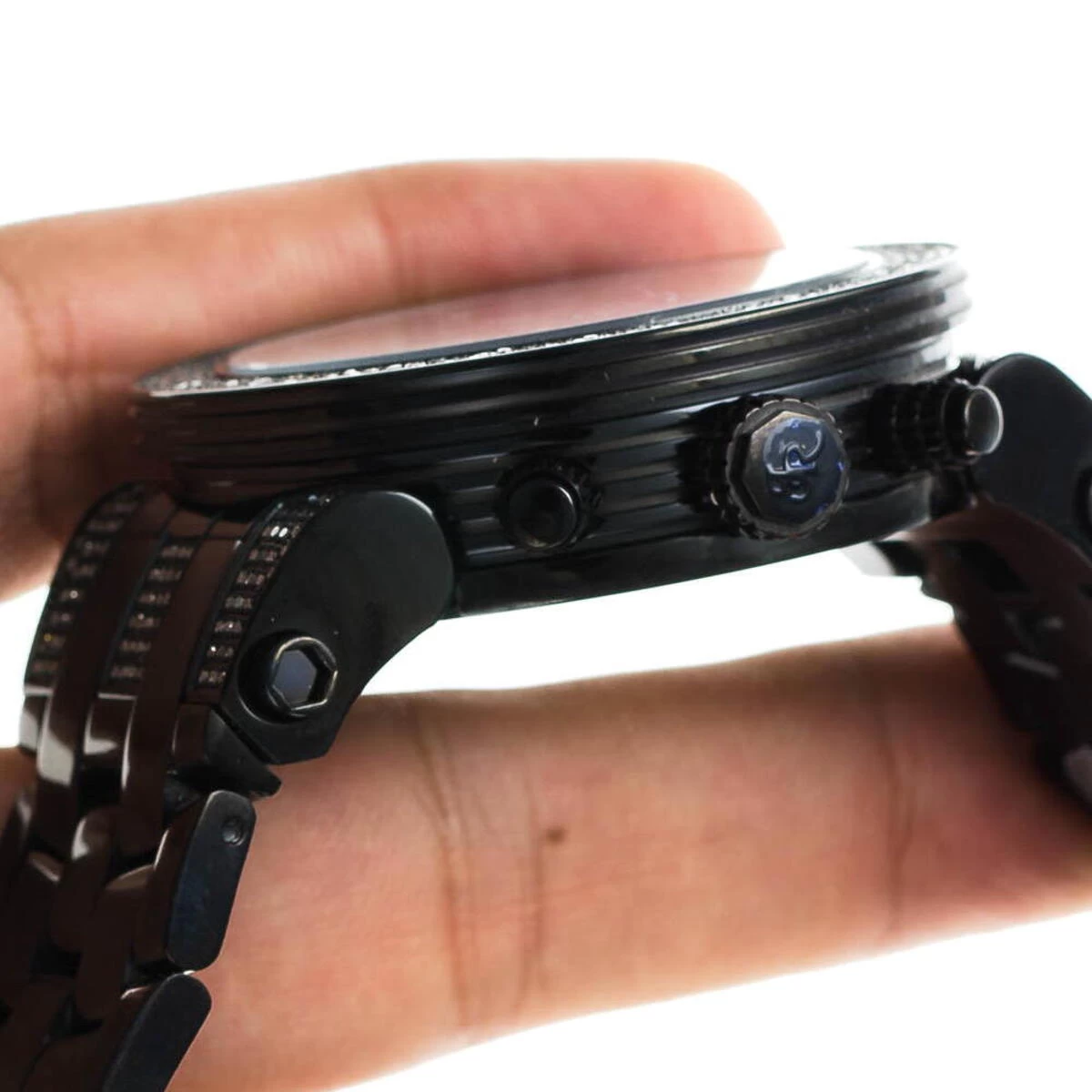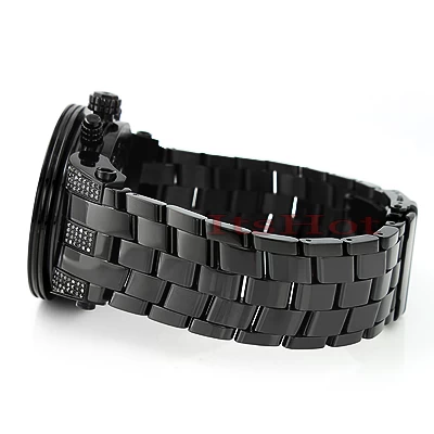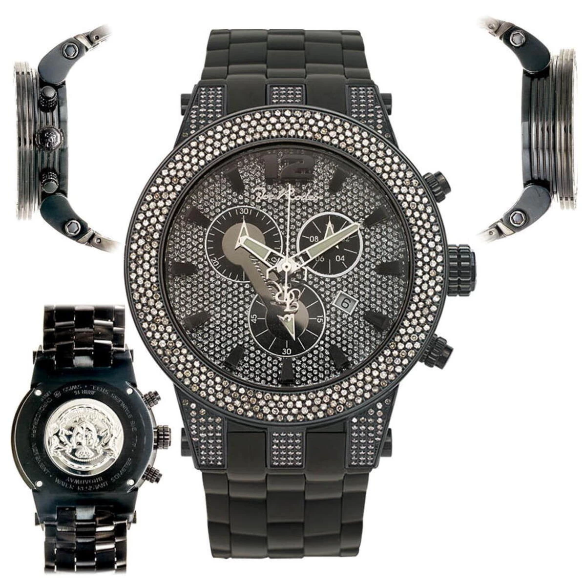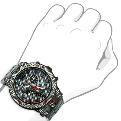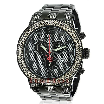 This New Joe Rodeo Broadway Men’s Diamond Watch features 5.0 carats of genuine diamonds on the bezel and lugs of the black tone stainless steel case. This Joe Rodeo diamond watch showcases a dial paved in sparkling stones with three chronograph subdials, a date display window at the 4 o’clock position, three-dimensional hour markers and a black tone stainless steel bracelet. This Joe Rodeo Broadway diamond watch comes with two interchangeable rubber bands in different colors.