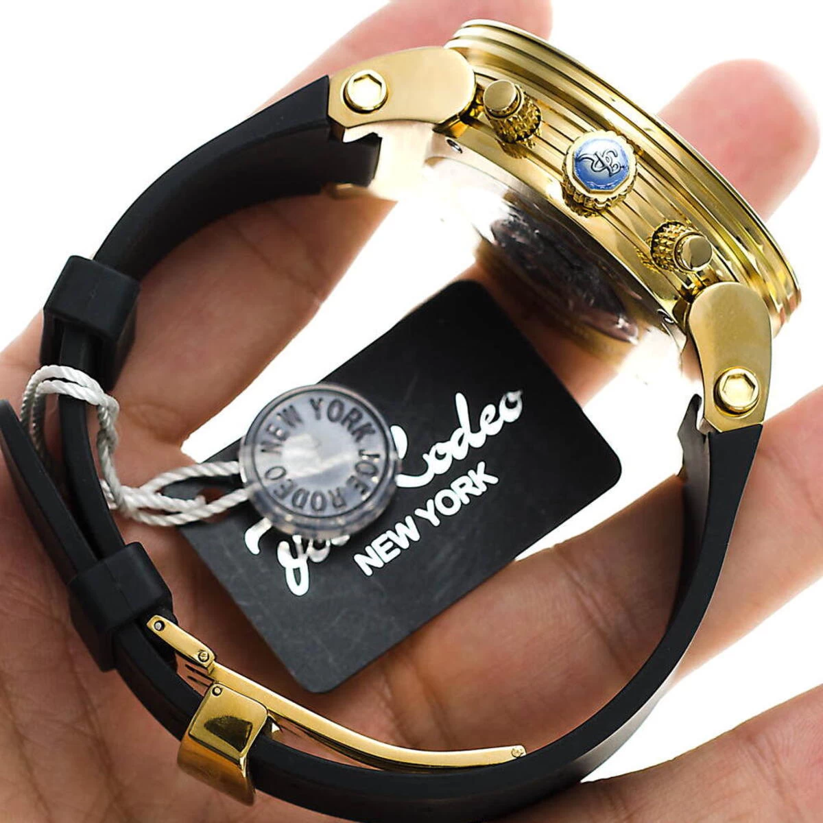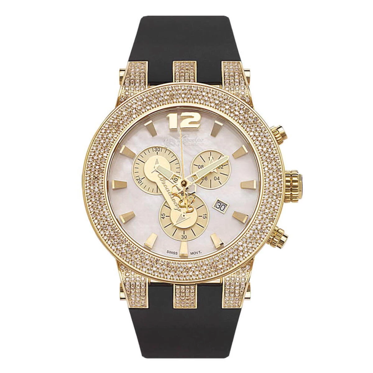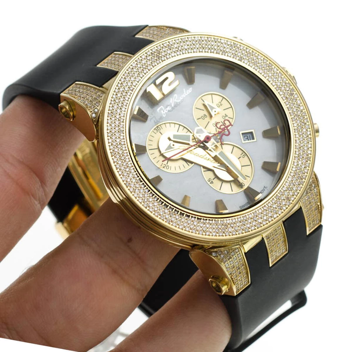 Luxurious Joe Rodeo Watches: This Broadway Men’s Diamond Watch features 5.00 carats of sparkling diamonds on the bezel and lugs of the yellow gold tone stainless steel case. This Joe Rodeo diamond watch showcases a white mother of pearl dial with three yellow gold tone chronograph subdials, a date display window at the 4 o’clock position, three-dimensional hour markers and a black rubber watch band. This Joe Rodeo Broadway diamond watch comes with two interchangeable rubber bands in different colors. The patented strap adjusts once for a perfect fit, and comes on and off with the press of a button.