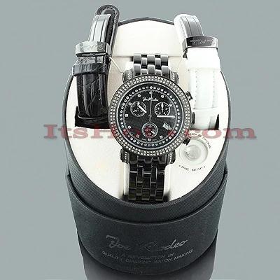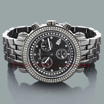 This Joe Rodeo Classic Diamond Watch Chronograph features 1.75 carats of genuine diamonds on the bezel of the black tone stainless steel case. This Joe Rodeo diamond watch showcases a black dial with three black chronograph subdials, a date display window at the 4 o’clock position, and a black tone stainless steel band. This luxurious men’s diamond watch by Joe Rodeo is equipped with a super accurate Swiss-made chronograph quartz movement.