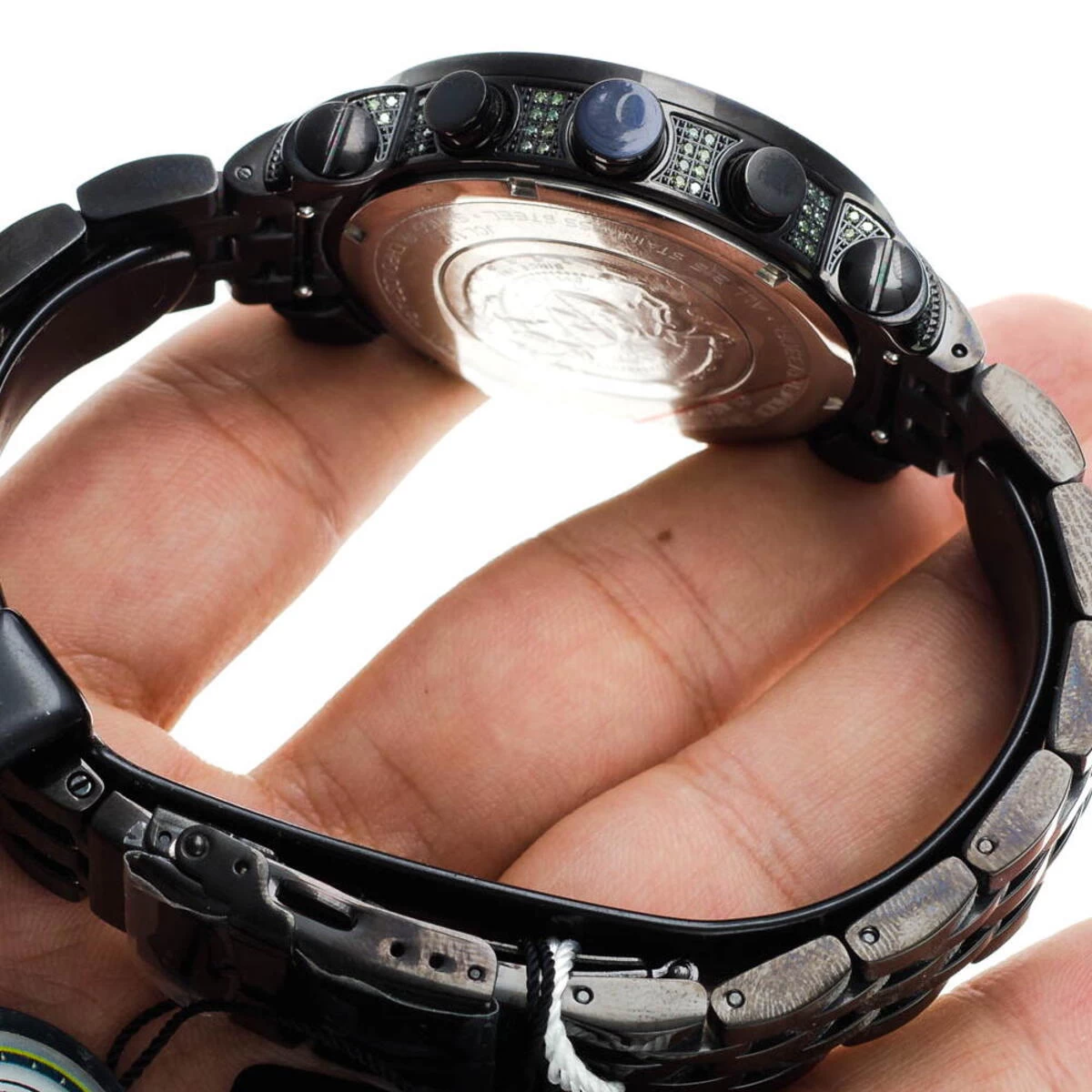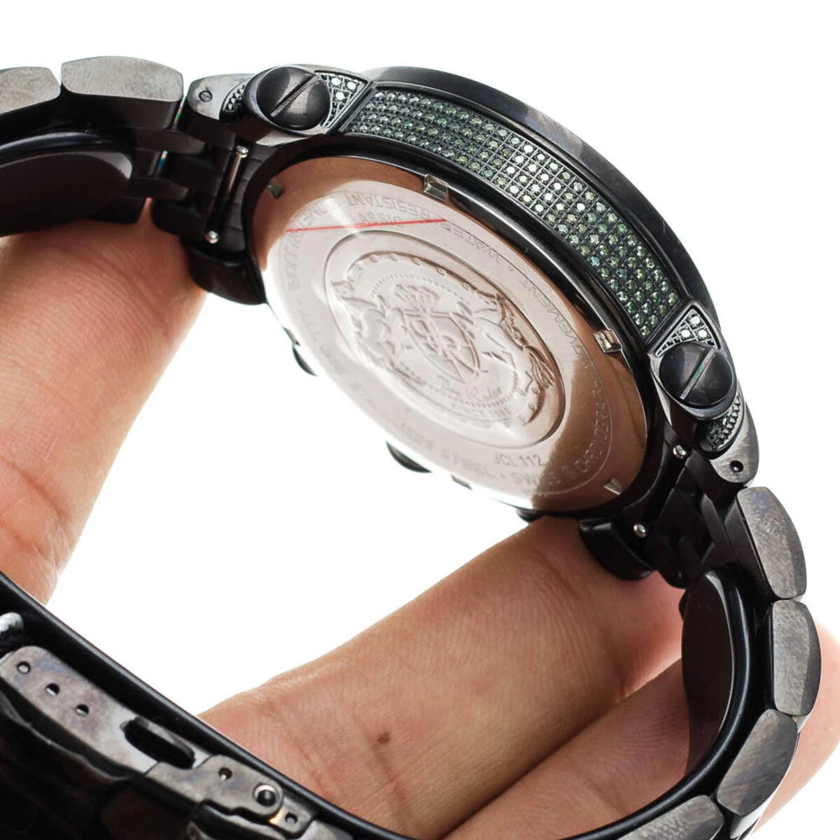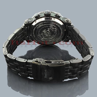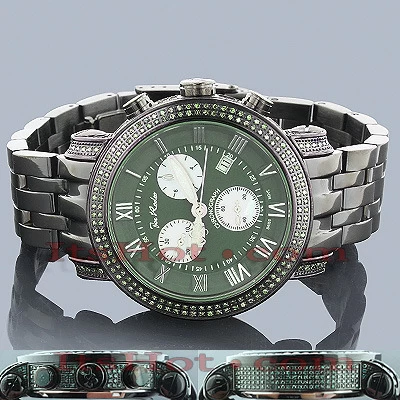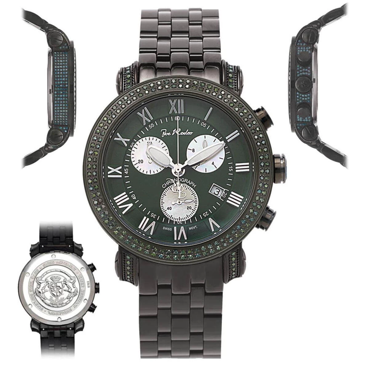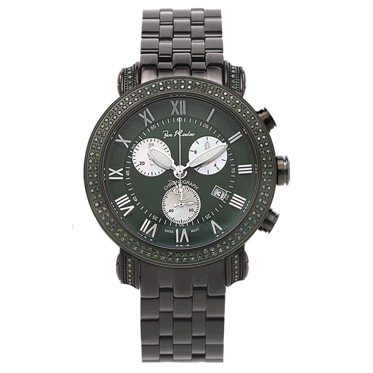 Unique Joe Rodeo Watches! This JoJo Classic Diamond Watch for Men by Joe Rodeo features 3.50 carats of sparkling green diamonds on the bezel, sides and lugs of the black stainless steel case. This Joe Rodeo diamond watch showcases a green dial with three white mother of pearl chronograph subdials, a date display window at the 4 oclock position, and a black stainless steel band. This luxurious men’s diamond watch by Joe Rodeo is equipped with a super accurate Swiss-made chronograph quartz movement. The case is water-resistant to 100m (330 ft).