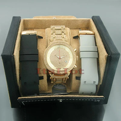 This men’s Joe Rodeo JoJo Master Diamond Watch features 7.35 carats of authentic diamonds on the bezel, lugs all around the polished yellow gold stainless steel case. The stainless steel band has three diamond links on each side. This iced out watch from Joe Rodeo watches collection is equipped with a fine Swiss-made quartz chronograph movement with date indicator. This men’s diamond watch comes with two interchangeable rubber bands in different colors. The patented strap adjusts once for a perfect fit, and comes on and off with the press of a button.