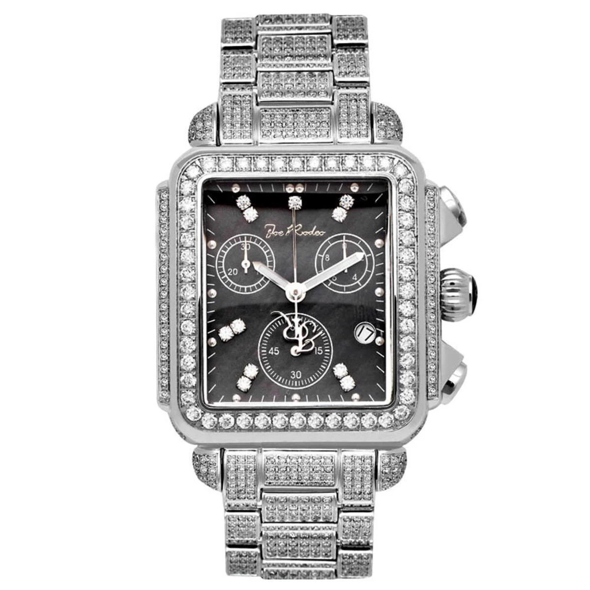 Fabulous Joe Rodeo Watches! This Joe Rodeo Madison Diamond Watch is paved in 10.25 carats of genuine diamonds, each masterfully set around the bezel, on the sides of the silver tone stainless steel case, lugs and the band. The black mother of pearl face features three chronograph subdials and a date display at 4 o’clock. This luxurious Joe Rodeo diamond watch is conveniently water resistant and comes with 2 extra watch bands in different colors.