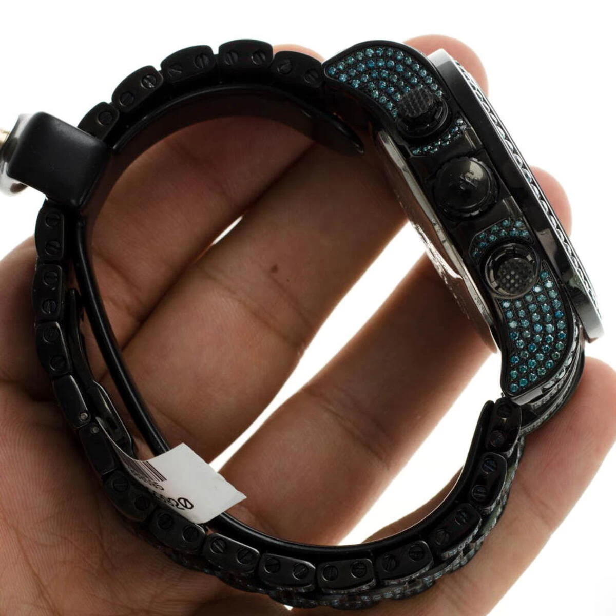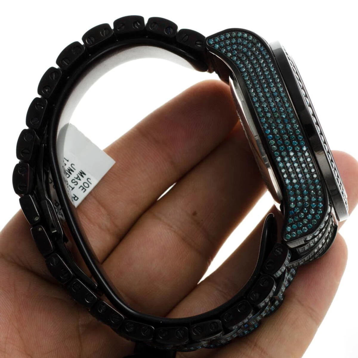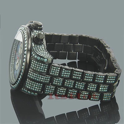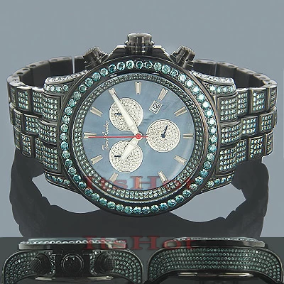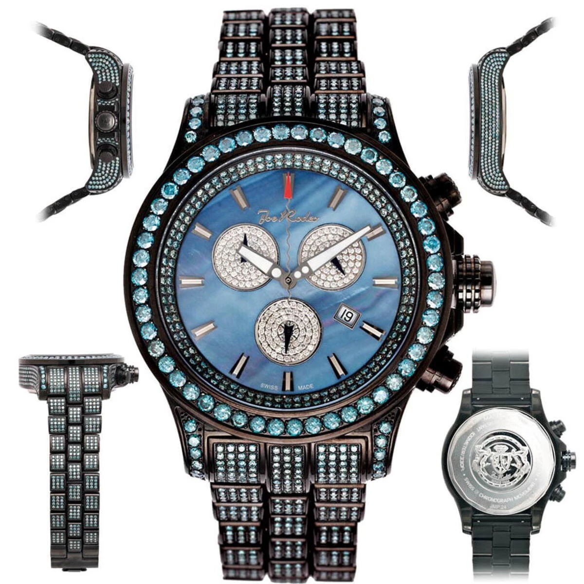 Luxurious Joe Rodeo Watches! This Men’s Blue Diamond Watch – Joe Rodeo Master Pilot men’s watch – features 27.70 carats of beautiful, fancy blue diamonds on the bezel, sides and lugs of the black stainless steel case and band. This exquisite Joe Rodeo diamond watch showcases a blue mother of pearl dial with three chronograph subdials paved in sparkling white stones, a date display window at the 4 o’clock position, all protected by a scratch-free crystal glass. This luxurious men’s blue diamond watch by Joe Rodeo is equipped with a super accurate Swiss-made chronograph quartz movement. The case is water-resistant to 100m (330 ft).
