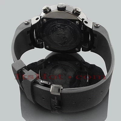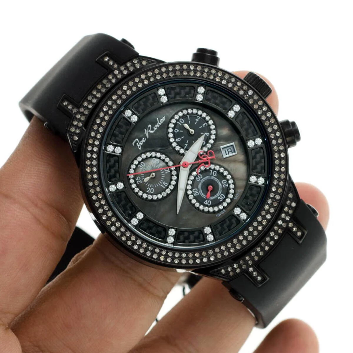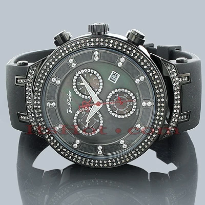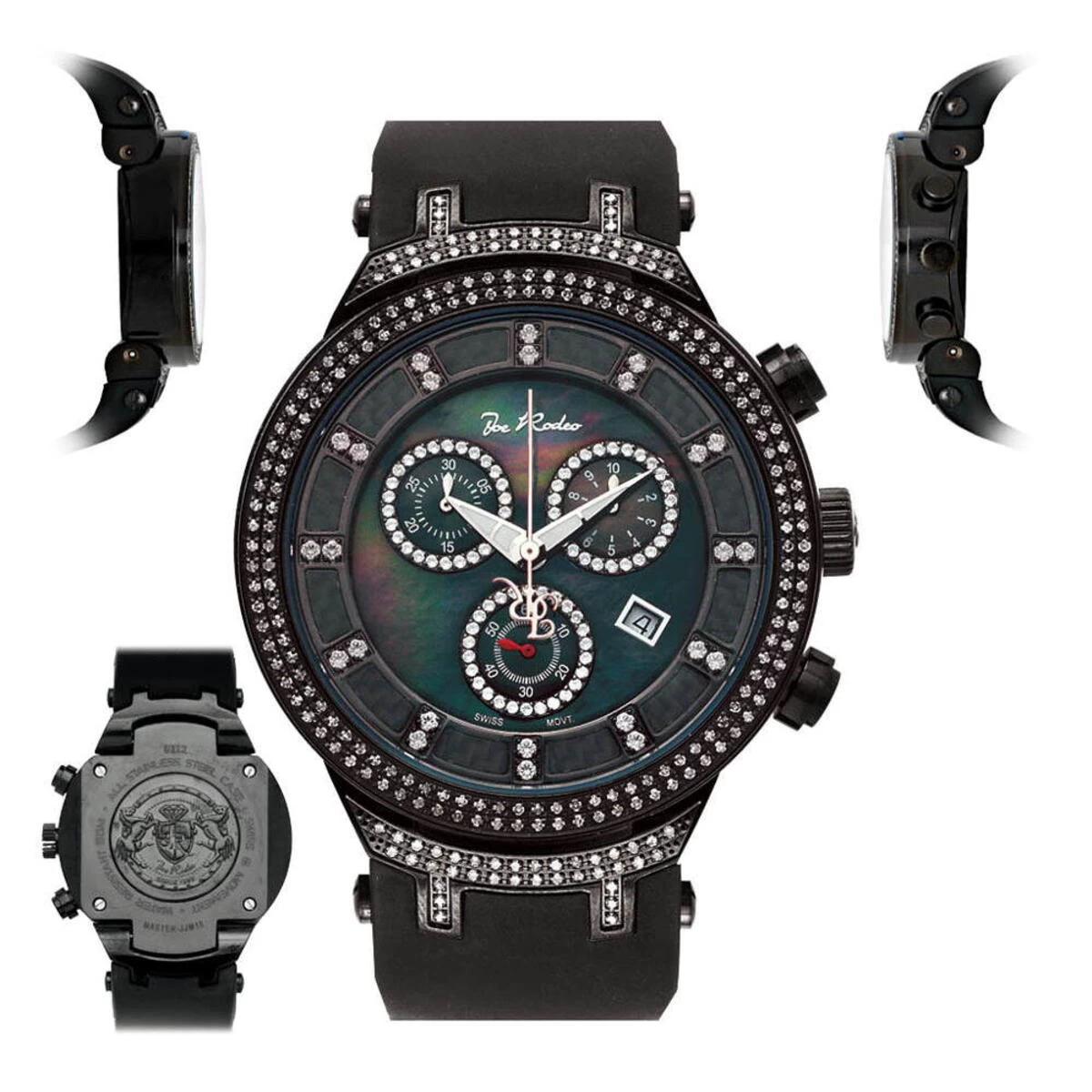 Unique Joe Rodeo Watches! This Men’s Diamond Watch packs 2.20 carats of genuine diamonds on a polished black stainless steel case and lugs. This watch model has a black mother of pearl face with three chronograph subdials on it. The fine Swiss-made quartz movement is set in a water-resistant to 50 m (165 ft) case. This men’s diamond watch from Joe Rodeo watches collection comes with two interchangeable rubber straps in different colors. The patented strap adjusts once for a perfect fit, and comes on and off with the press of a button.
