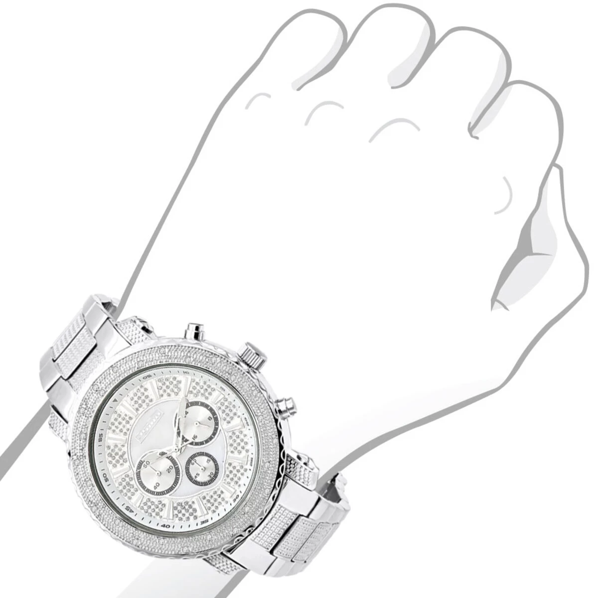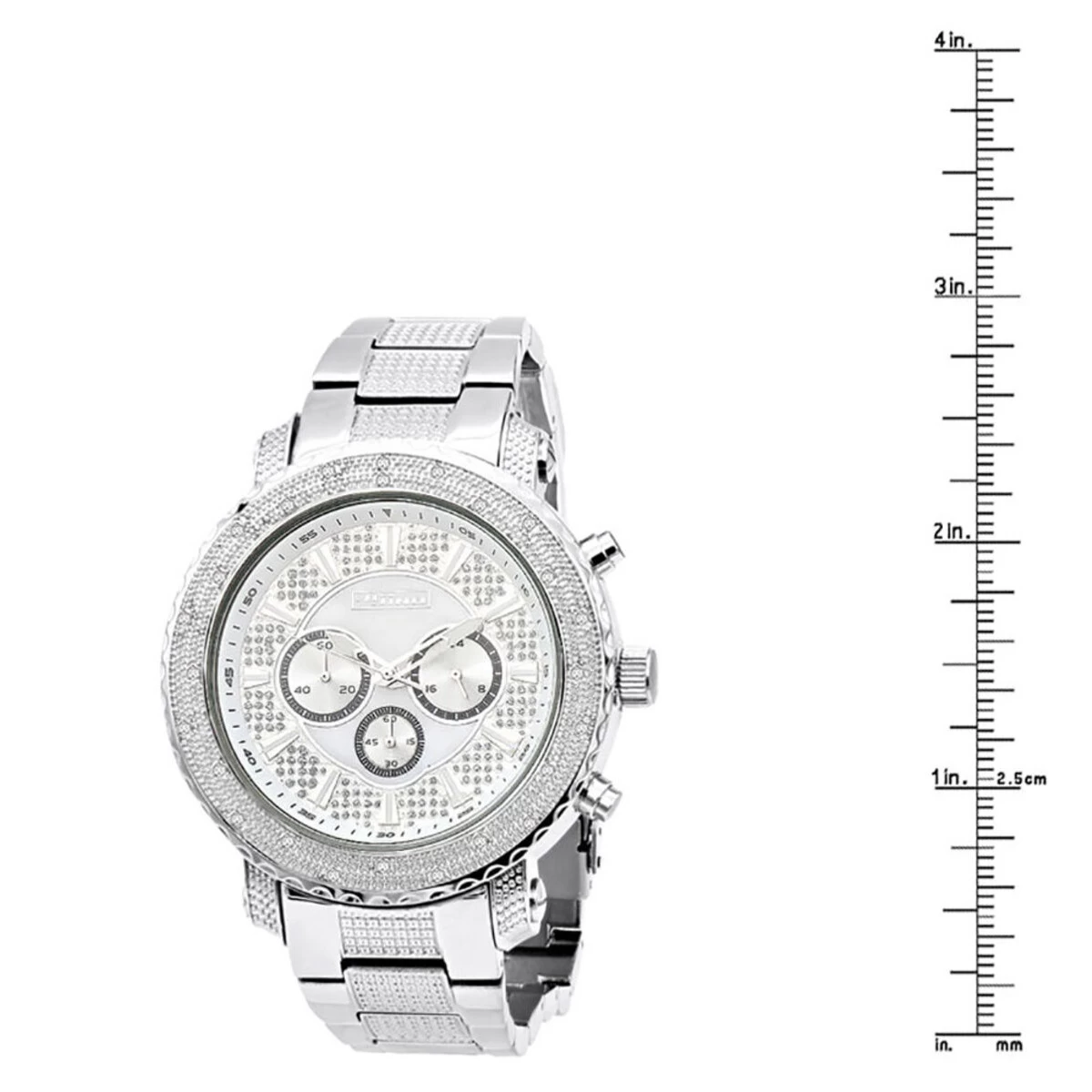 Men’s Chronograph Real Diamond Watch with 0.25 carats of white genuine diamonds. Oversized 52mm stainless steel case and stainless steel band. High quality Japanese quartz movement with Analog display, provide precise time keeping. 1 years manufacturer’s warranty by JoJino. 30 Days full return/exchange policy. Watches Ship out Insured with signature tracking from NYC Diamond District