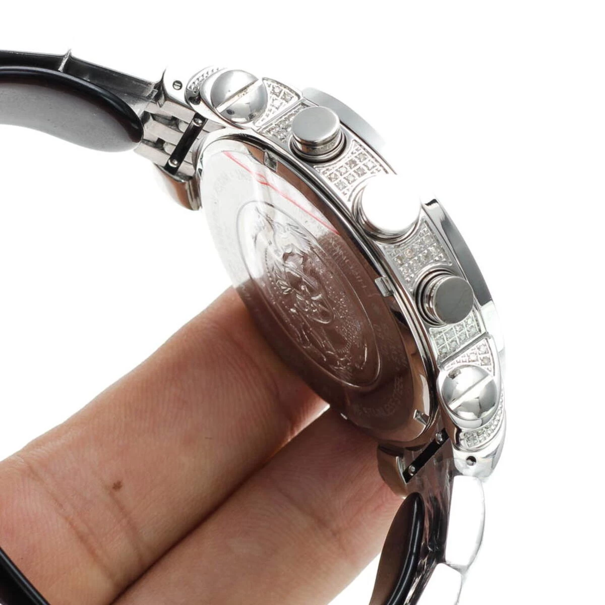 This 3.50-carat JOJO diamond bezel Joe Rodeo watch showcases a round polished stainless steel case, scratch-free crystal glass, individually numbered and engraved stainless steel case-back. Fine Swiss-made quartz movement with chronograph function, center second and date. Water-resistant to 100 meters. Comes with two interchangeable straps in different colors. The patented strap adjusts once for a perfect fit, and comes on and off with the press of a button.