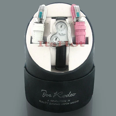 Fabulous JOJO Diamond Watches! This Joe Rodeo Heart Watch Sahara features 1.40 carats of diamonds set around its white mother of pearl face with two dials. The polished, water-resistant, heart-shaped silver stainless steel case houses an accurate Swiss-made quartz movement with a dual time zone function. Two interchangeable straps in different colors come with the watch. The patented strap adjusts once for a perfect fit, and comes on and off with the press of a button.