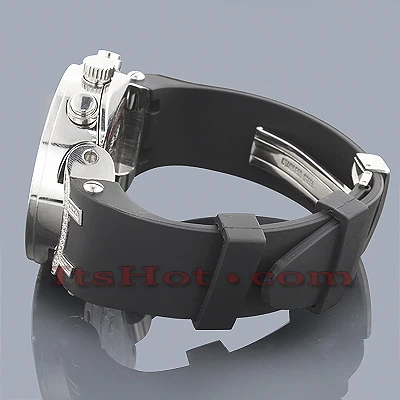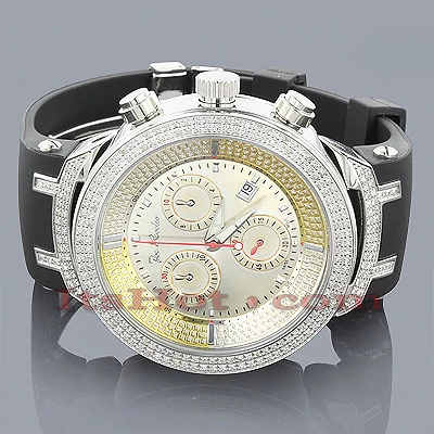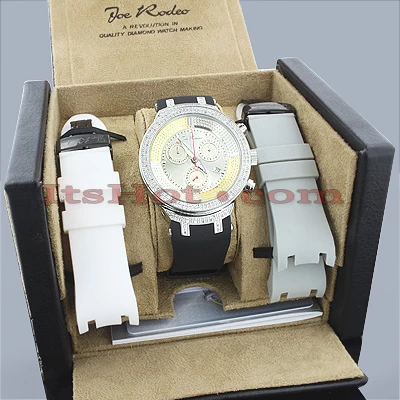 This 2.20-carat JOJO Joe Rodeo watches collection piece features a polished stainless steel case, scratch-free crystal glass, individually numbered and engraved stainless steel case-back. Diamond Bezel, Silver Stainless Steel case and Silver dial with yellow inlays. Fine Swiss-made quartz movement with chronograph function, center second and date. Water-resistant to 100 meters. Comes with two interchangeable rubber straps in different colors. The patented strap adjusts once for a perfect fit, and comes on and off with the press of a button.